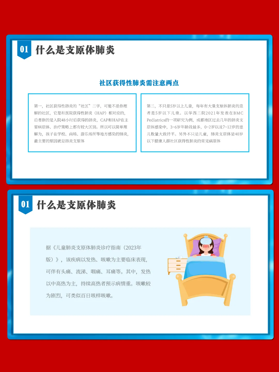 该疾病主要经飞沫传染,潜伏期 2-3 周,青少年发病率最高,也是我国 5 岁及以上儿童最主要的社区获得性肺炎。但 3-6 岁儿童感染人数最多,0-2 岁及 7-12 岁患儿数量也不少,40 岁以下健康人群也可能感染。临床表现以发热、咳嗽为主,发热多为中高热,持续高热提示病情较重,咳嗽剧烈且类似百日咳样。