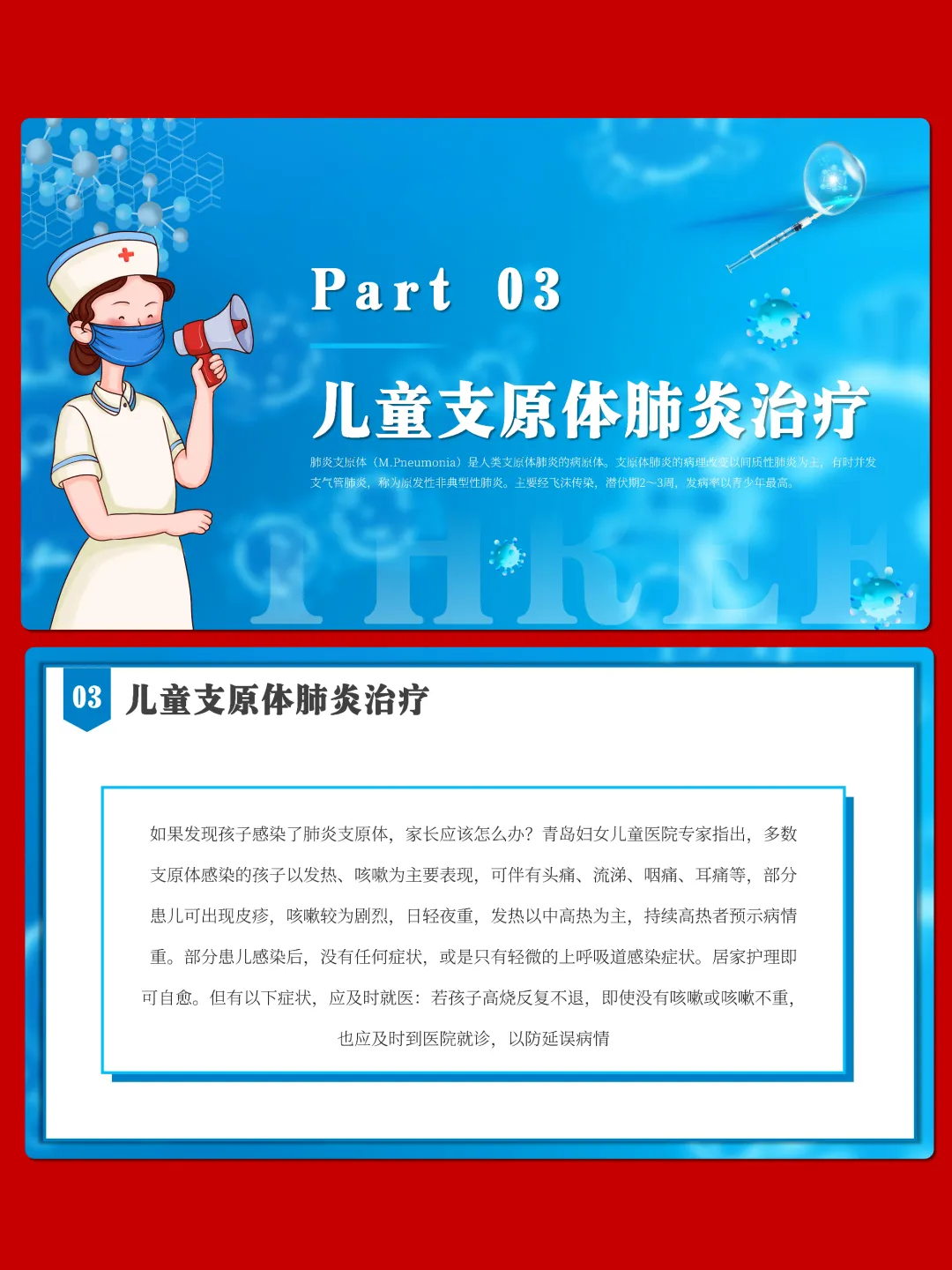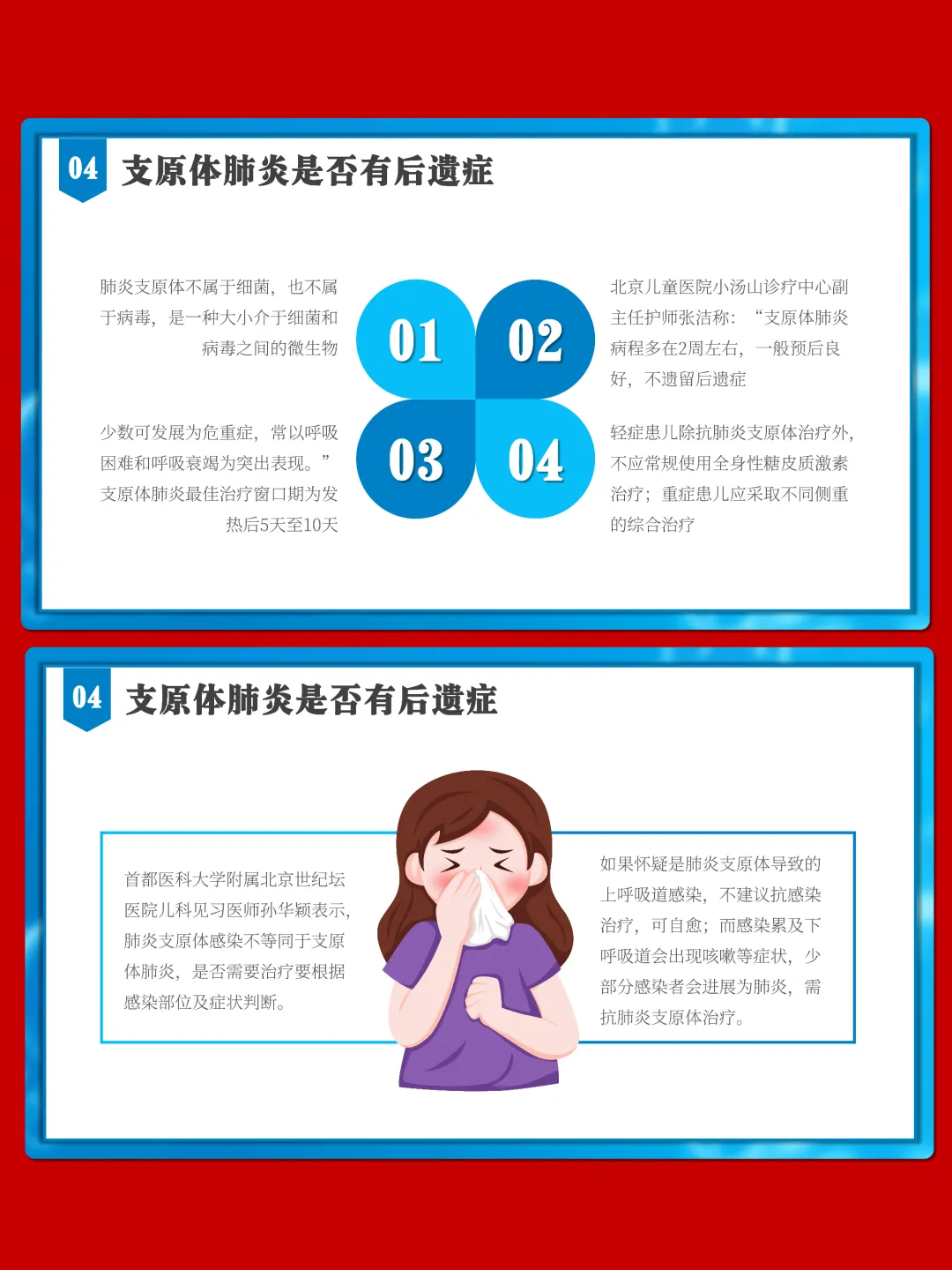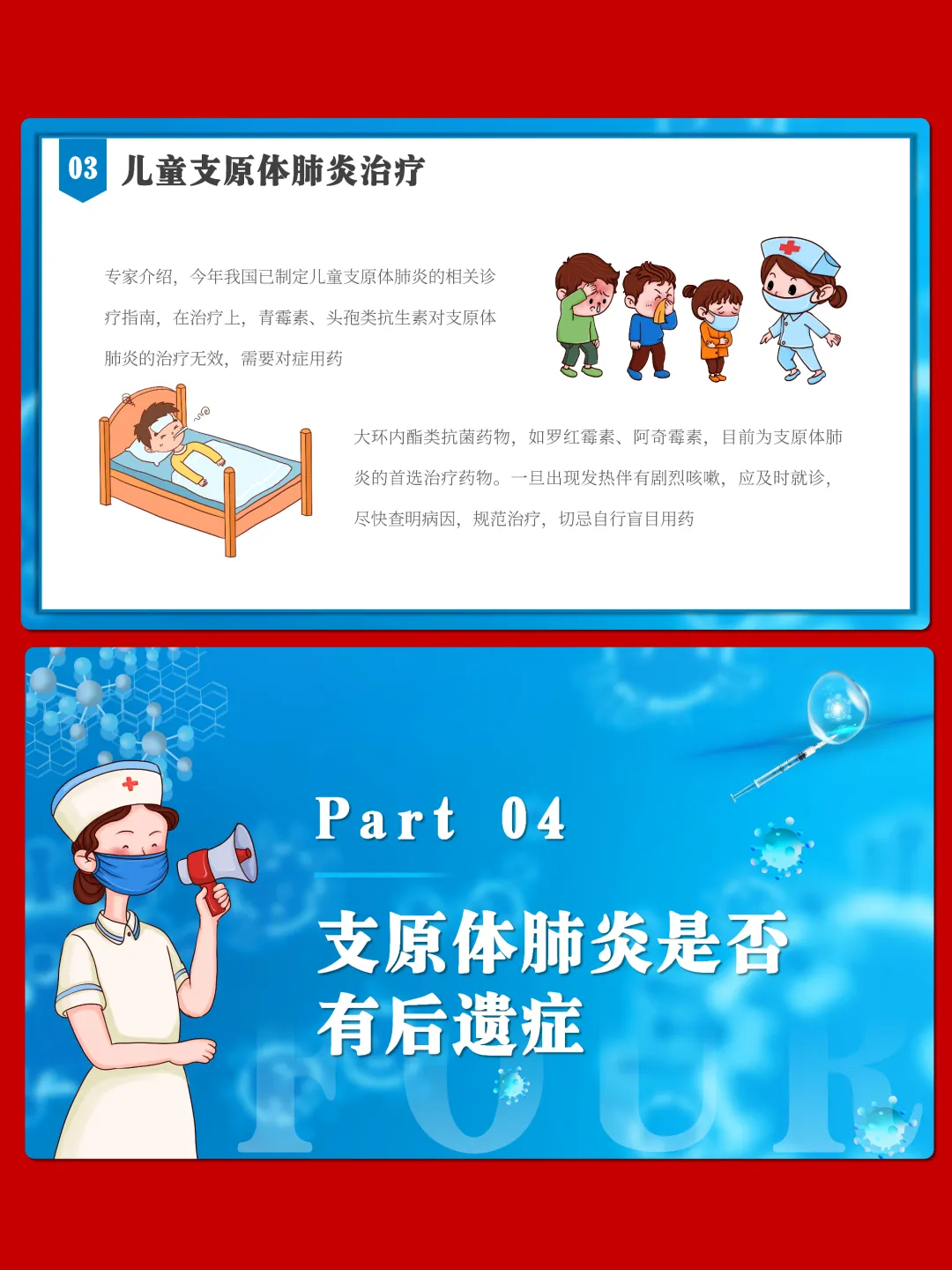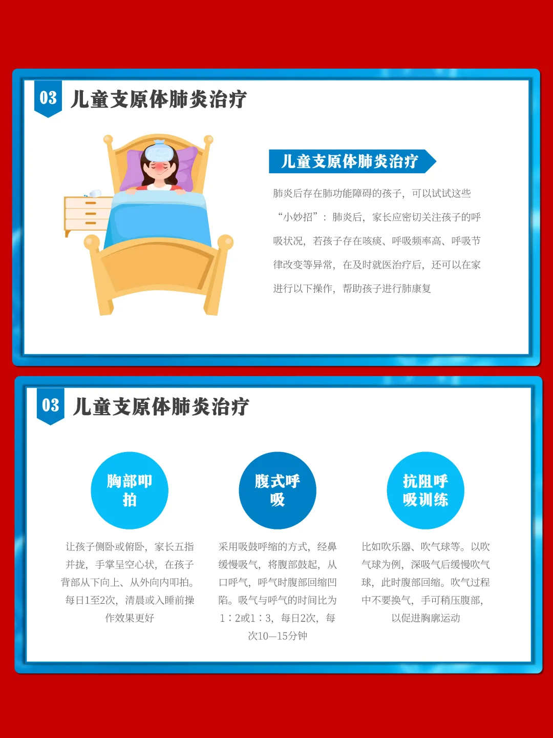 治疗方面,青霉素、头孢类抗生素无效,首选大环内酯类抗菌药物如罗红霉素、阿奇霉素。高烧反复不退时需及时就医,肺炎后可通过胸部叩拍、腹式呼吸等帮助肺康复。多数患者病程约 2 周,预后良好,一般无后遗症。