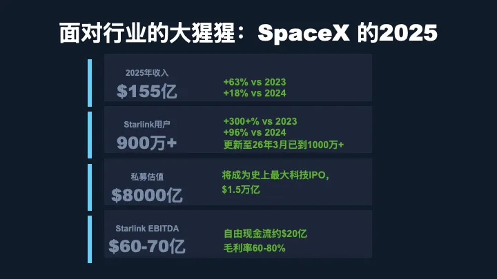 2025年,SpaceX 的收入达到了$155亿美元,相比2023年增长了63%,相比2024年增长了18%。这个增速在一个已经如此大体量的公司里,是非常惊人的。