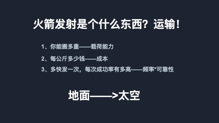 剥掉所有光环,火箭就是一种运输服务。它做的事情,就是把一定质量的东西,从地面搬到太空中某条特定的轨道上。跟快递本质上没有区别。关键变量就只有三个: