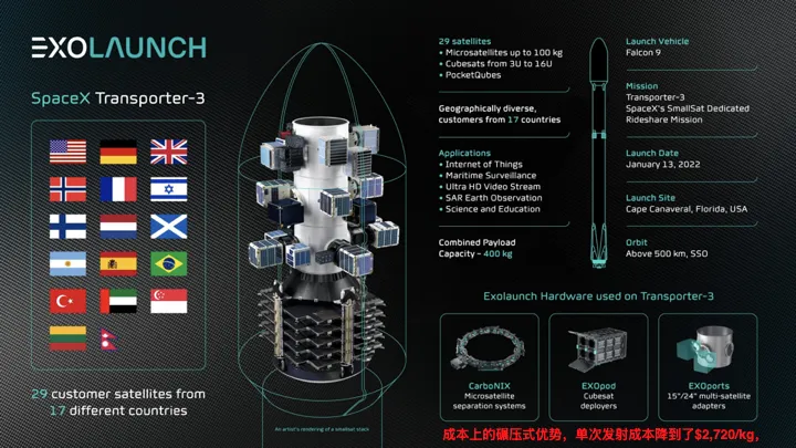 这张图里还展示了一个细节:中间那个分离系统的供应商叫Exolaunch这是一家专门做卫星搭载服务的公司。它们设计了各种适配器和分离系统,帮助小卫星客户搭顺风车上天。