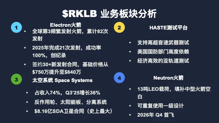 第二,HASTE亚轨道测试平台。这是Electron的衍生产品,专门用来做高超音速武器测试。美国国防部对这个平台高度依赖,Rocket Lab已经被纳入了Kratos价值14.5亿美金的MACH-TB 2.0高超音速测试合同。2025年完成了3次 HASTE 发射任务。