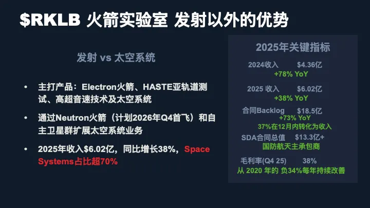 2025年全年收入6亿美金,同比增长38%。2025年预计全年收入将达到约6亿美金,继续保持近40%的增速。毛利率在最近一个季度达到了38%的历史新高,而且还在持续改善。合同积压订单超过18亿美金,其中有49个火箭发射合同在手。手里的现金储备超过10亿美金。