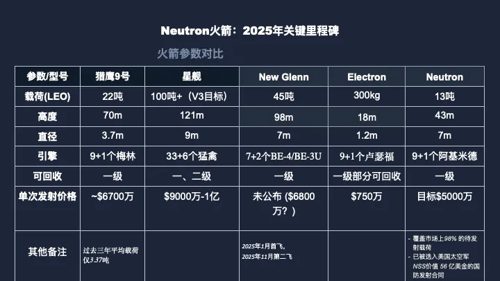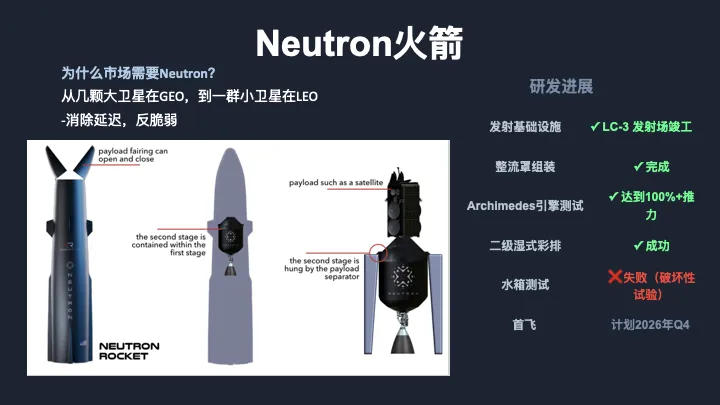 第四,正在研发中的 Neutron 火箭。这是一枚中型可复用火箭,LEO运力13吨,瞄准的是SpaceX Falcon 9 所在的那个最肥的市场,也就是大型星座部署和国家安全任务。发射台LC-3已经启用,火箭计划2026年下半年首飞。一旦成功,Rocket Lab就从太空专车,升级成了既是专车也可以是包机的全服务运营商。