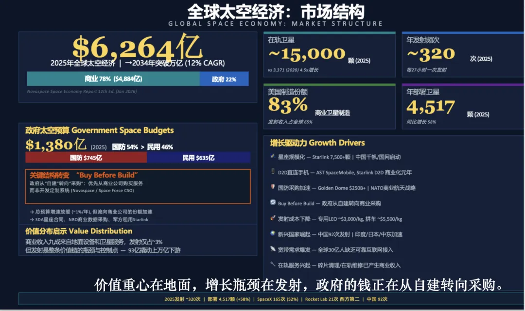 今天我写这篇公众号文章,原本的动力是和身边的朋友讨论 Rocket Lab,聊多了干脆写文章吧,写着写着,干脆做一次分享吧。做分享么,至少至少要张 PPT 吧,于是在打磨 PPT 的过程中,我发现比起任何一家公司的故事,更值得讲的是整个行业正在经历的结构性转折:发射成本在十年间降了两个数量级,卫星从昂贵的奢侈品变成批量生产的消费品,政府从自己造变成买服务。一个万亿美金的市场正在悄然重塑。