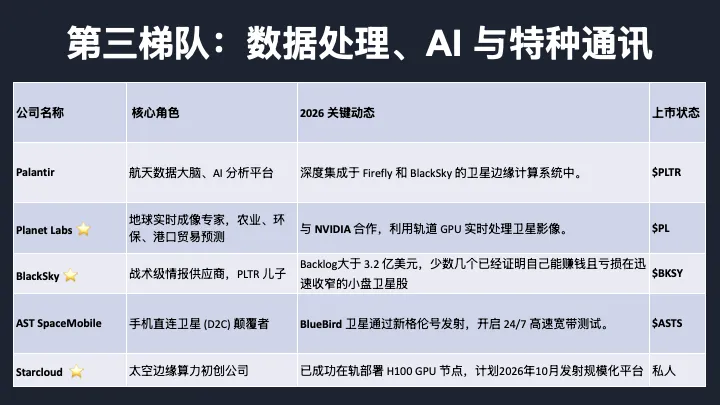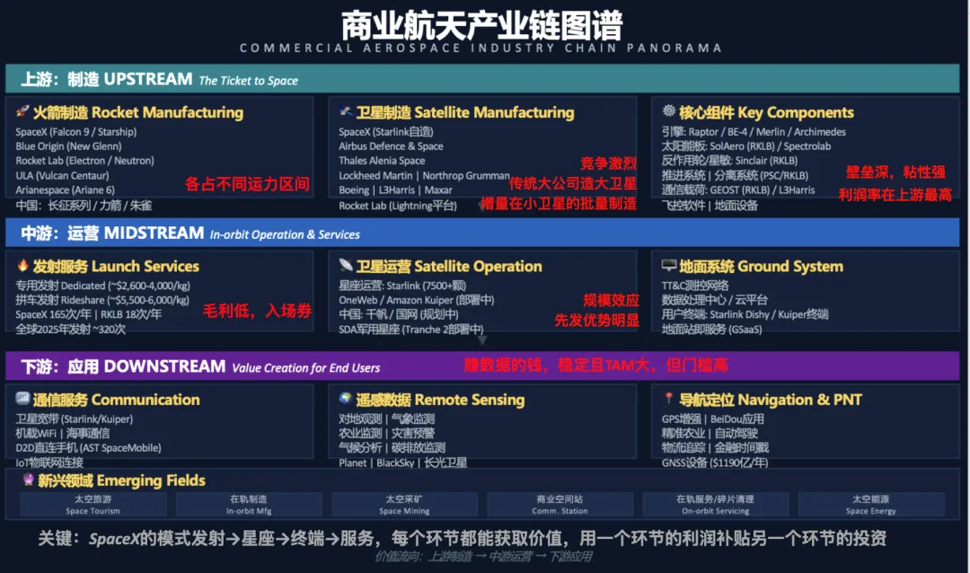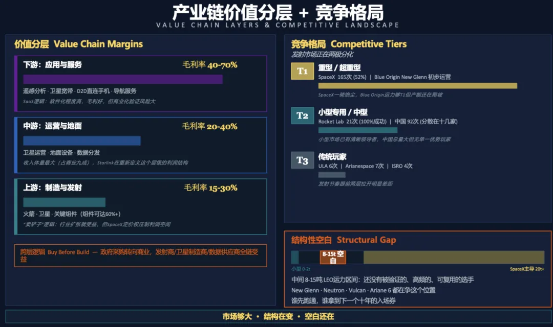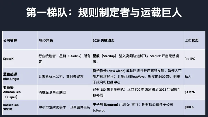 首先按价值链位置划分,第一梯队是基础设施建设者,平台型公司,赢家通吃的逻辑;第二梯队是承包商和设施商,靠政府合同驱动,现金流相对稳定;第三梯队是数据和应用层,软件毛利高,但严重依赖上游的发射成本;第四梯队是任务执行者,项目制,波动性很大。