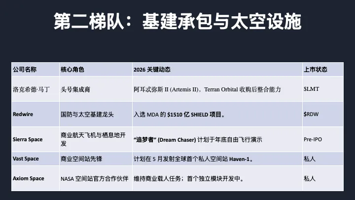 第二梯队,我叫它基建承包与太空设施。这些公司不一定造火箭,但它们负责造卫星的大脑和能源系统,还有太空里的生活设施。简单说,火箭只是把东西送上去,真正让卫星能工作、让人能在太空生活的,是这些公司。