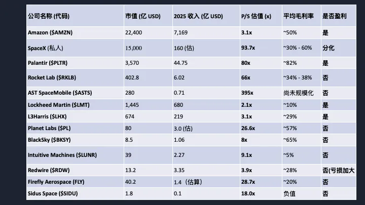 然后看盈利情况。除了SpaceX以外,只有4家公司盈利:Amazon、Palantir、洛克希德·马丁、L3Harris。但这4家都不是纯太空公司,太空只是它们业务线的一部分。也就是说,纯太空公司目前全部都还在烧钱换增长阶段。这说明,整个行业还在基础设施建设期,应用层还没真正起来。