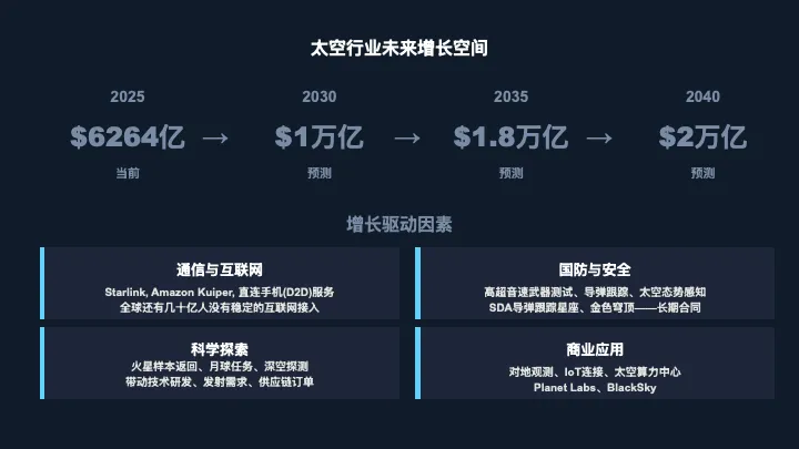 看这张时间轴。2025年,全球太空经济约6130亿美金,这是当前的规模。到2030年,预计会突破1万亿。然后到2035年1.8万亿,2040年2万亿。