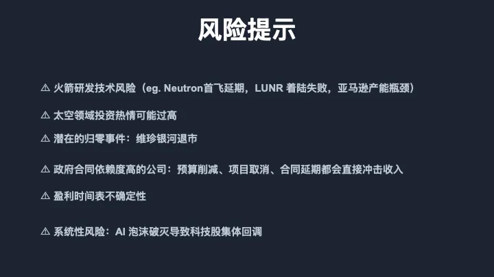 很多公司说2026年盈利,2027年正现金流,但这些都是基于很多假设的。发射延期、客户流失、成本超支,任何一个因素都可能把盈利时间表往后推一两年。第六,系统性风险。AI泡沫破灭会导致科技股整体回调,太空板块作为高估值、高风险的细分领域,会首当其冲。还有地缘政治风险,中美太空竞争升级可能带来供应链断裂、技术管制、甚至直接的冲突。