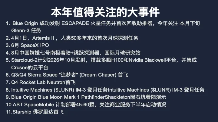 Starcloud-1是一个非常早期但给我们的信号极强的地面震动,商用GPU(而非特制航天芯片)是可以在太空运行AI的。如果这个假设可行且顺利的话,太空经济的TAM就不再局限于我们想象中的通信/导航/遥感市场这些了,还要直接叠加上全球AI基础设施支出,想象力也就不止万亿规模了。计划2026年10月发射规模化平台,这个事关AI 这个叙事是否还能继续,也是非常值得关注的事情,我在这儿做了个特殊的记号。
