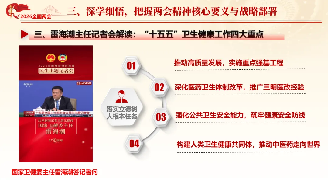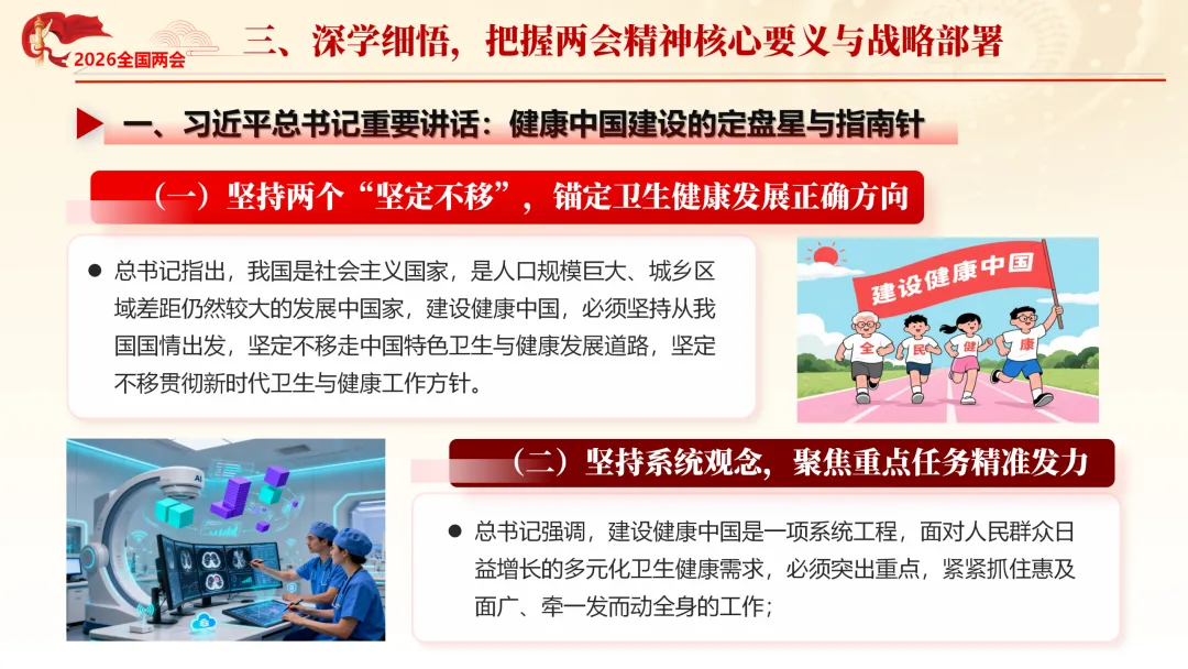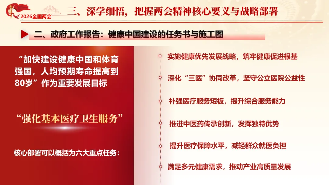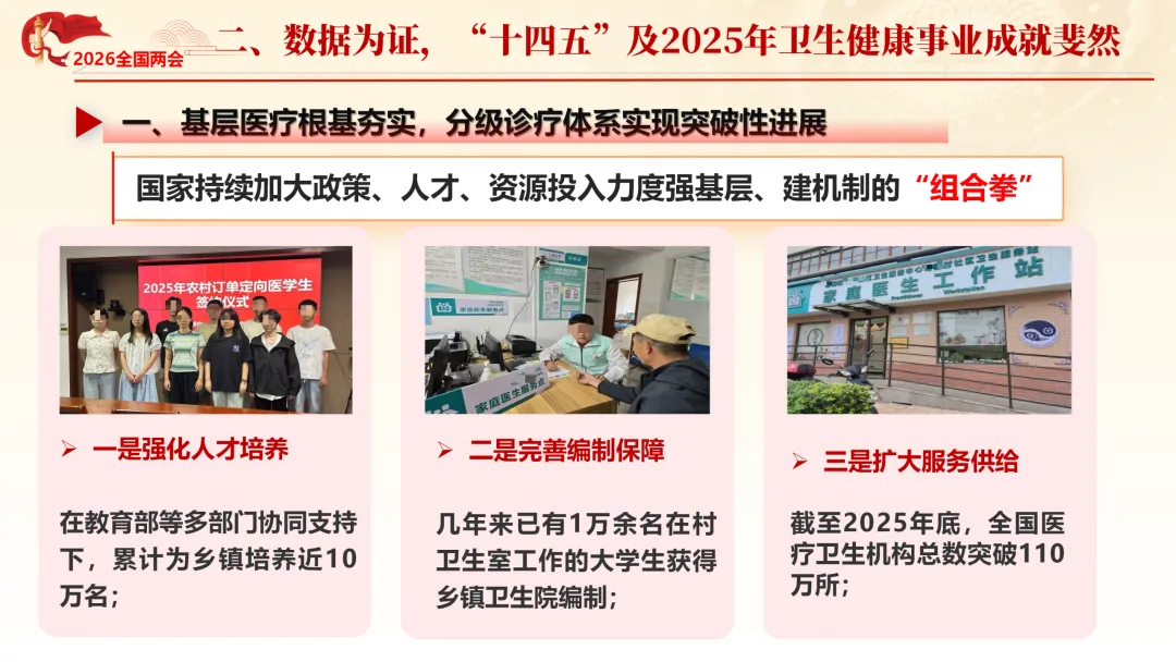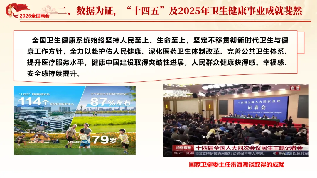 本次医疗系统专题*课聚焦两会精神核心要义,深入解读........关于卫生健康工作的......,系统梳理政府工作报告健康中国建设部署与..卫健委工作要求,以详实数据回望 “十四五” 卫生健康事业历史性成就,清晰展现基层医疗、服务可及性、一老一小保障、国民健康水平等领域的突破性进展。