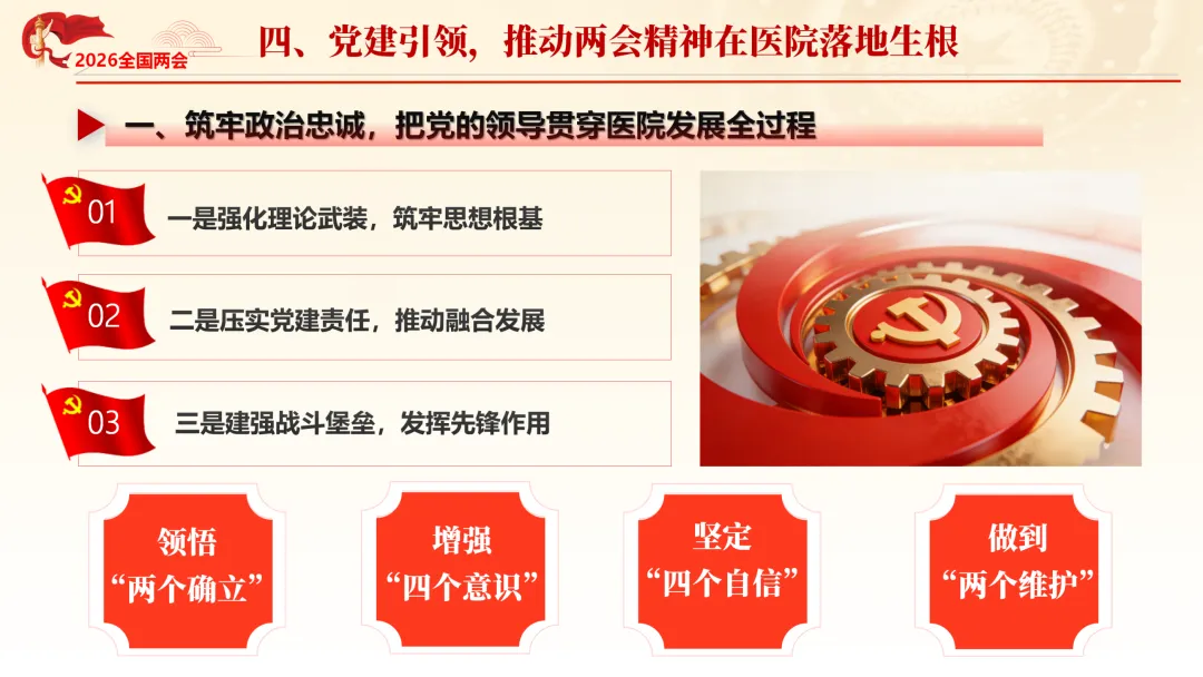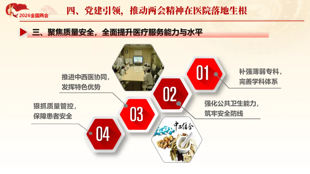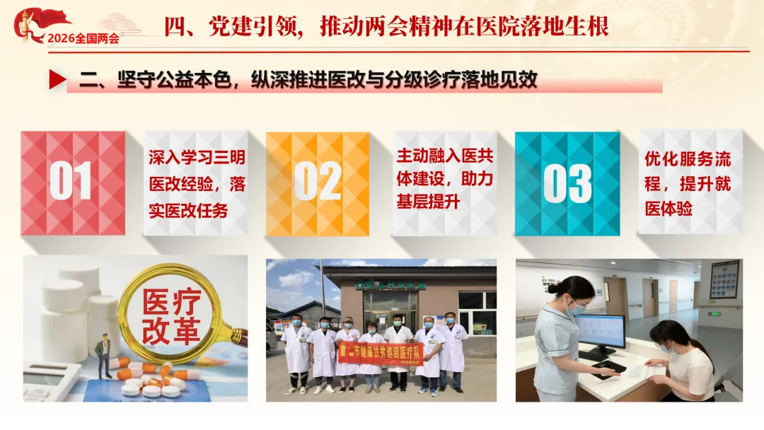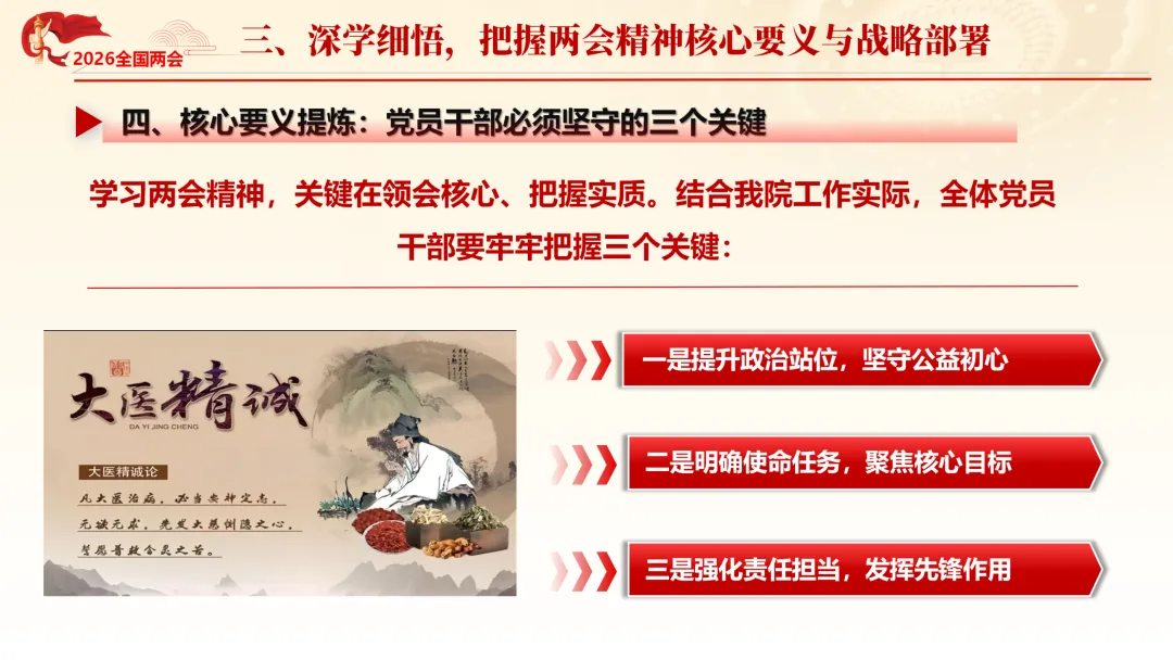 紧扣医院*建引领、医疗服务、改革发展实际,从筑牢政治忠诚、坚守公益本色、聚焦质量安全、践行健康使命、锤炼过硬作风等方面,明确医疗工作者践行使命的路径,凝聚起守护人民生命健康、推动医院高质量发展的奋进力量,全体*员干部投身健康中国建设思想行动遵循。