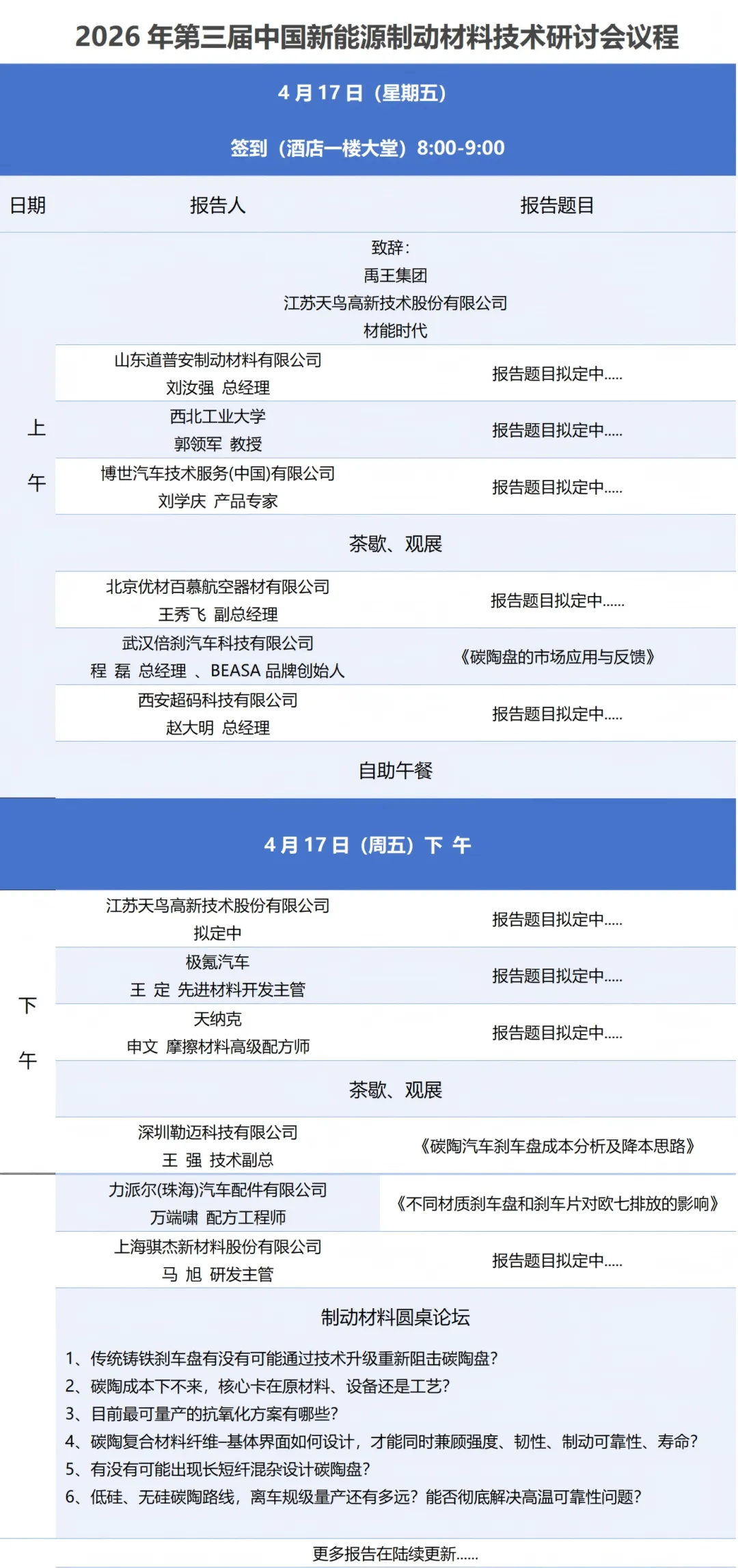 2026第三届中国新能源制动材料研讨会将于2026年4月16日-17日在江苏南京召开。本届会议将紧扣市场增长热点、技术创新前沿与政策标准新要求,旨在深入探讨制动材料如何更好地与智能化、轻量化趋势融合,并前瞻性地布局下一代技术。