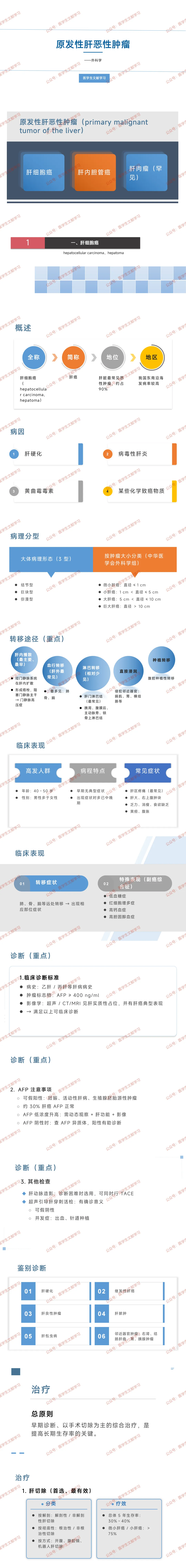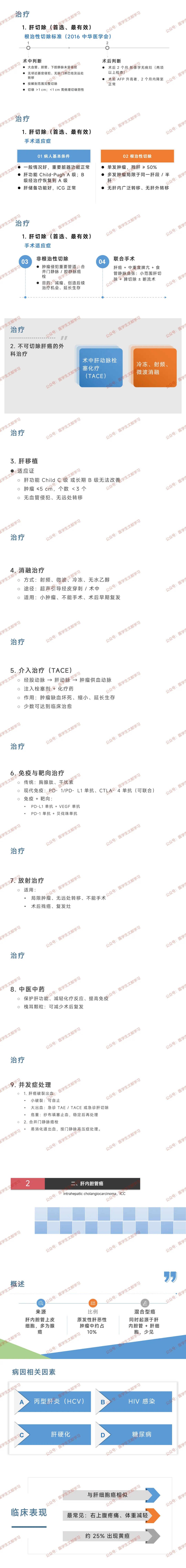 - 治疗:首选肝切除,晚期患者采用免疫 + 靶向治疗有效。