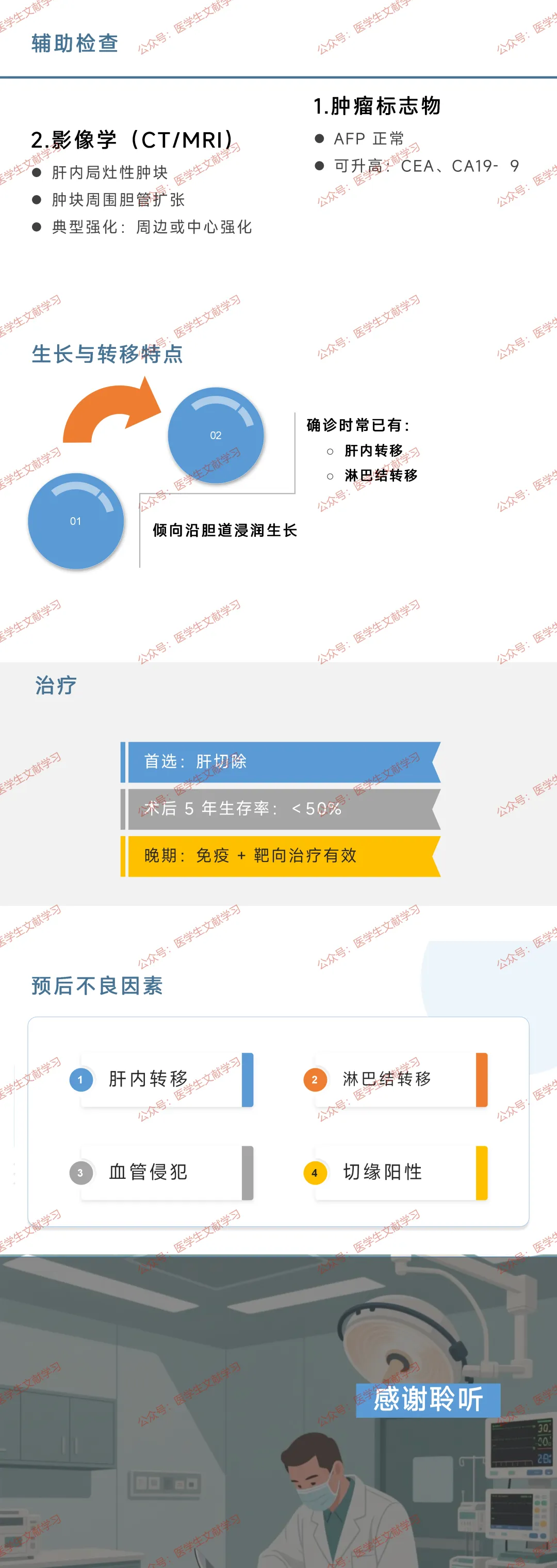- 预后:术后 5 年生存率<50%;肝内转移、淋巴结转移、血管侵犯、切缘阳性为预后不良因素。