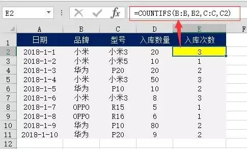 公式为:=SUMPRODUCT(({"小米";"小米";"华为";"小米";"华为";"小米";"OPPO";"OPPO";"华为";"华为"}=B2)*({"小米3";"小米5";"P20";"小米3";"P10";"小米3";"R15";"R16";"P10";"P20"}=C2))