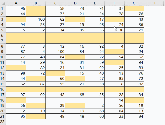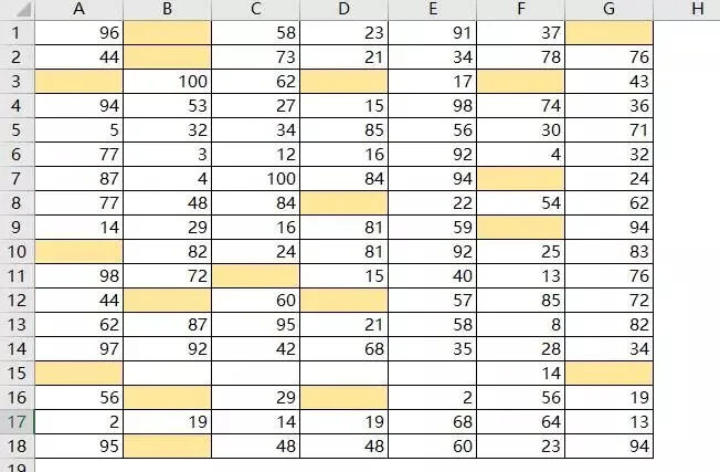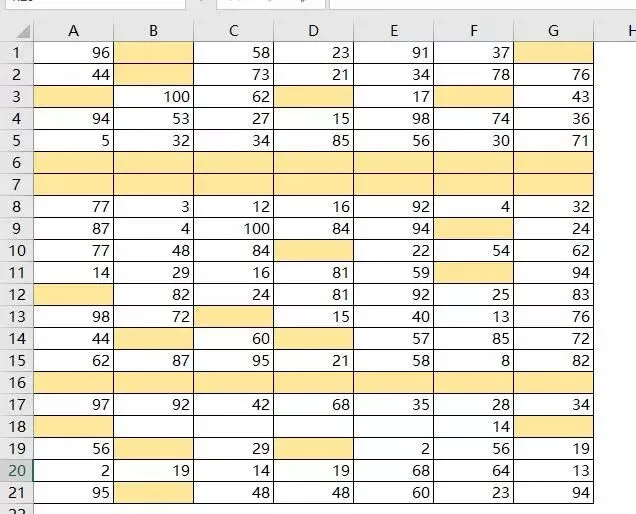 如下表,含有很多的空格,需要删除整行全为空格的行,比如第6、7行。