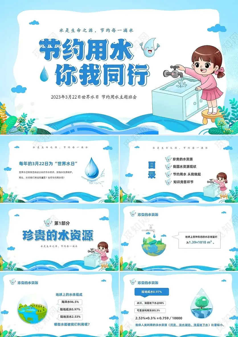 蓝色卡通儿童节约用水你我同行3月22日世界水日主题班会PPT