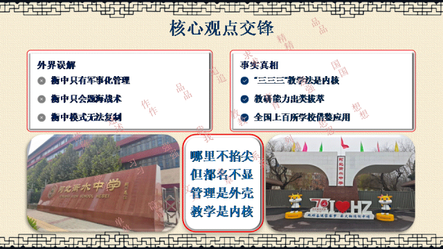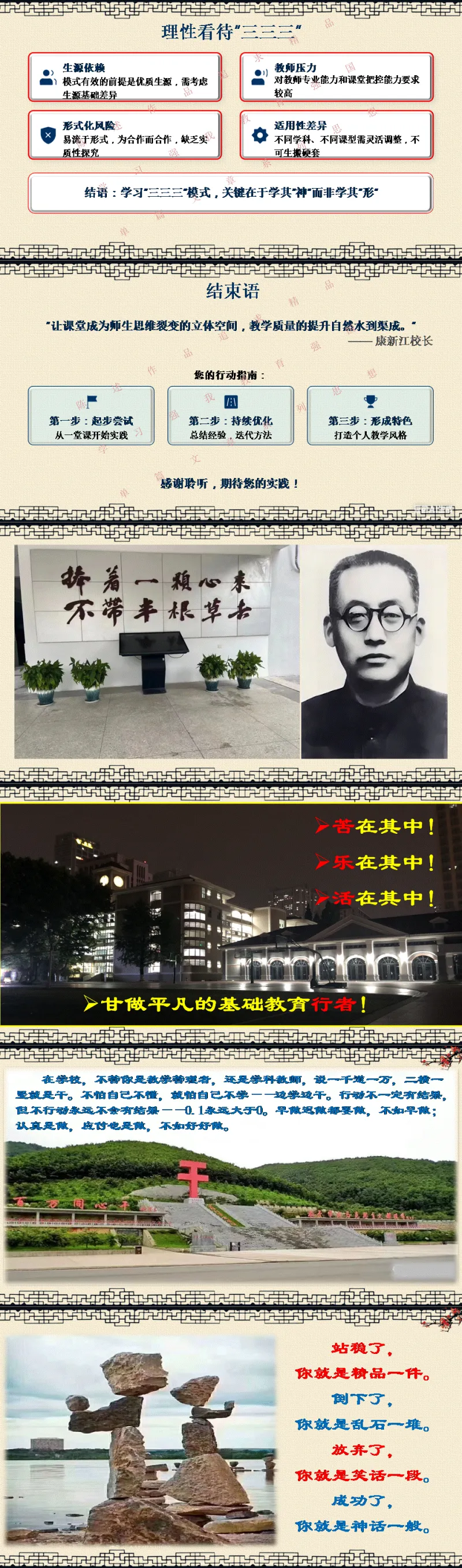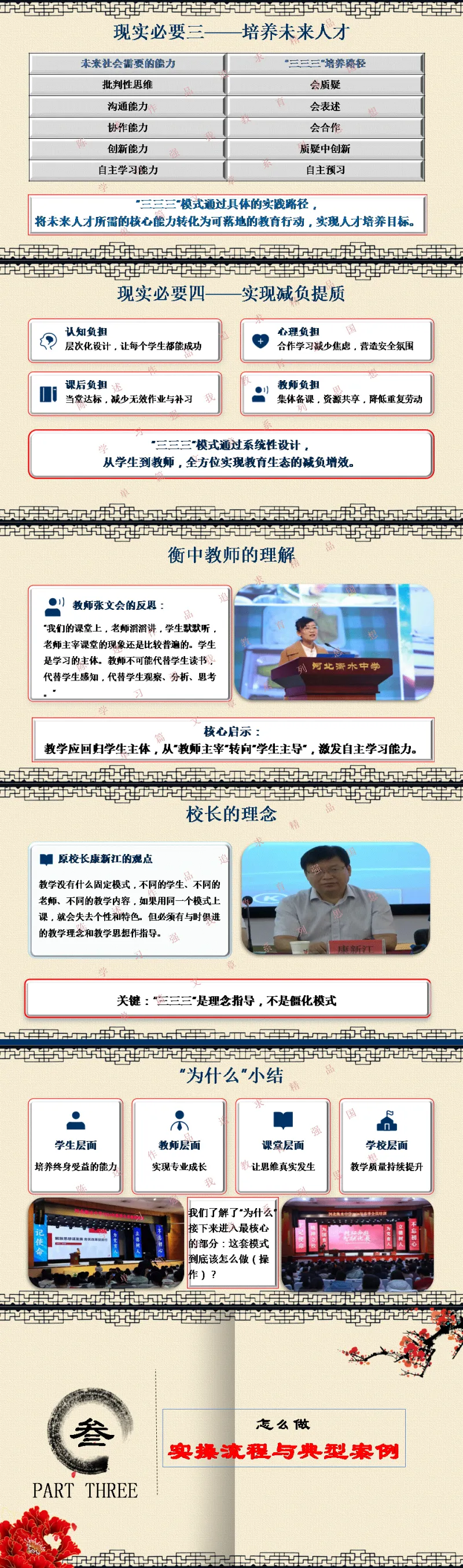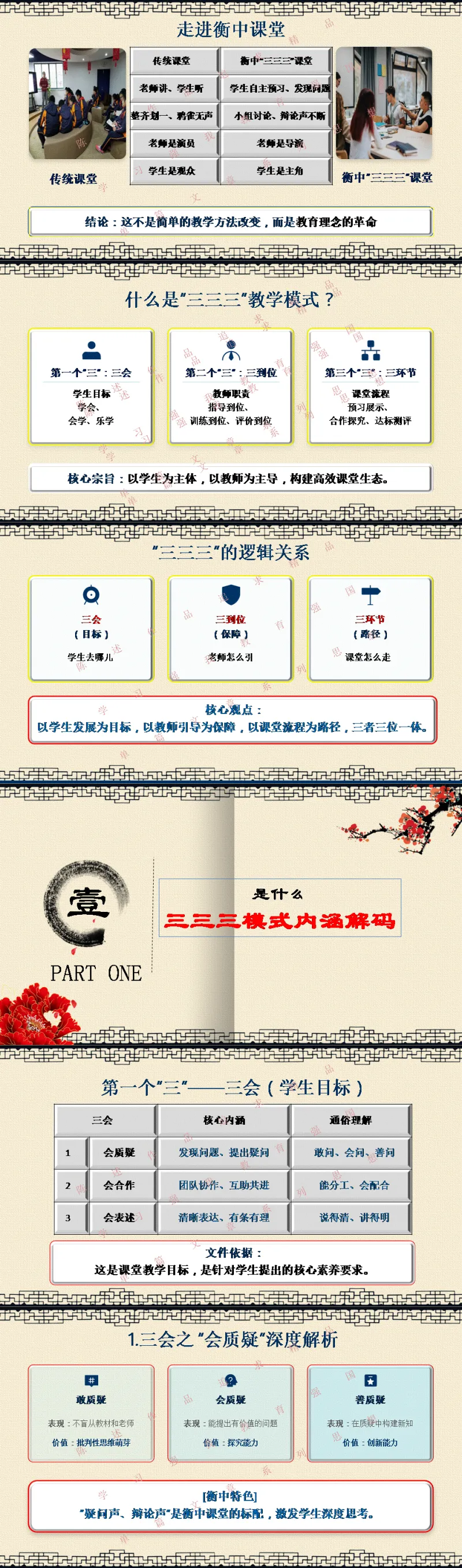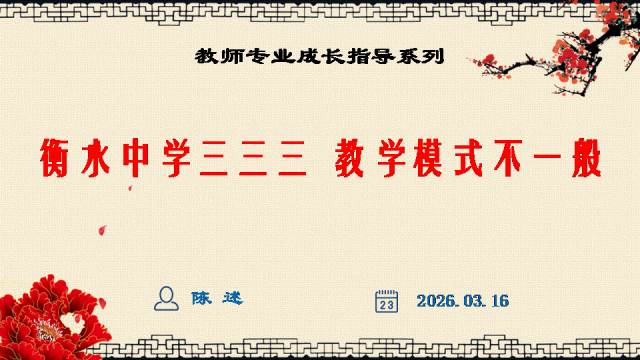 选择关注,关注陈述教学公众号,能力会提高。文末阅读一线校长更多原创内容。阅读提示:说起衡水模式,其内涵主要是指“激情教育、精细管理、高效课堂”,其中“高效课堂”多指李金池先生首在衡中创立、后在精中完善的衡水“6+1”模式,其实衡中也逐渐在“6+1”的基础上形成了自已的教学模式“333”。本课件是继《教师培训PPT: 衡水“6+1” 培训知其意》和《【教学培训PPT】高效课堂 三维定义》之后的又一高效课堂教学模式培训课件。精英中学6+1和衡水中学333虽同源但也各有千秋。本课件部分素材来自于网络,重在学习、研究与交流,(曾经的衡水中学帮扶学校的首任教学校长)并以此致敬衡水中学!若需原汁原味的具有动画音响功能的原版电子版PPT课件,请阅读到课件文末说明。线上线下讲座预定请联系陈述校长19946913958(微信同号)。