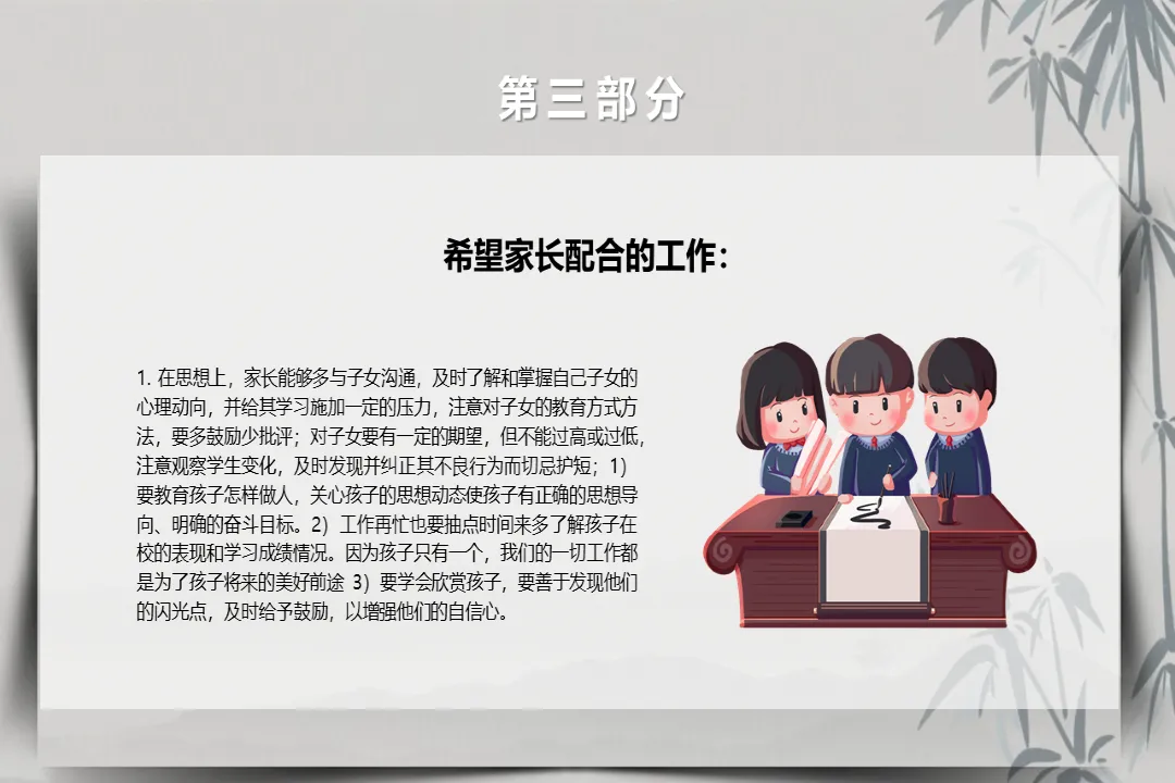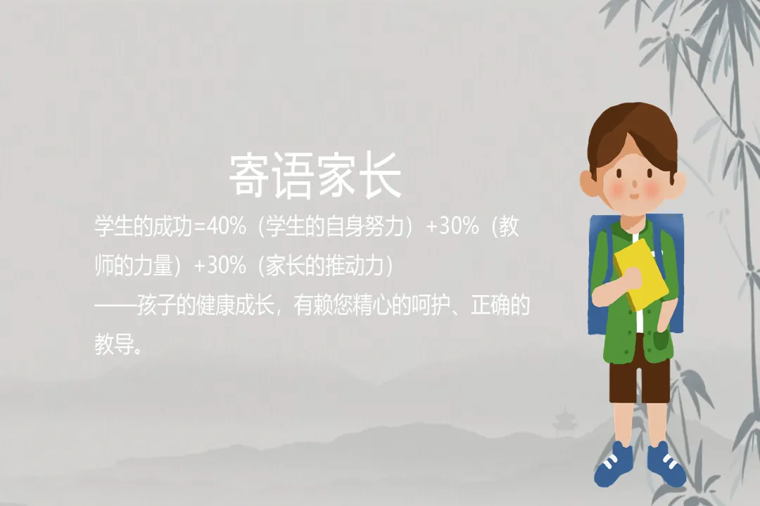 孩子的成长,是学生 40% 的自身努力、加教师 30% 的引导、再加家长 30% 的推动,家校配合尤为重要。在此也想和大家提几点配合建议:思想上多沟通、多鼓励,及时掌握孩子心理动向;生活上关注饮食安全、规律作息,做好榜样,引导孩子合理消费;学习上营造良好环境,不唯成绩论,多关注孩子的进步与不足,针对性查漏补缺。同时也请大家配合学校,不給孩子配备电子设备、不随意请假,合理规划孩子的周末时间,主动和老师保持联系。