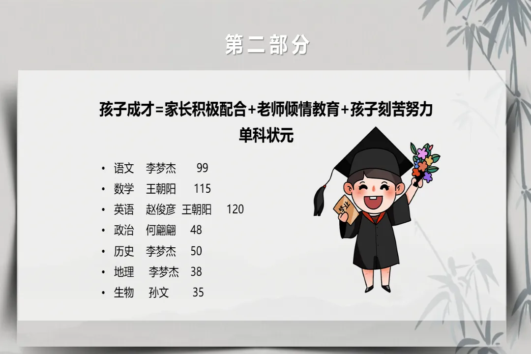 本次期中考试,孩子们的表现有亮点也有不足,班级涌现出了总分靠前的优秀同学,也有各单科状元,比如李梦杰同学在语文、历史、地理学科表现突出,王朝阳同学拿下数学、英语双科满分,这些成绩的取得离不开孩子的努力,也感谢家长的背后支持。但同时,部分孩子存在偏科、成绩波动的问题,后续我们也会针对性辅导,也需要家长配合跟进。