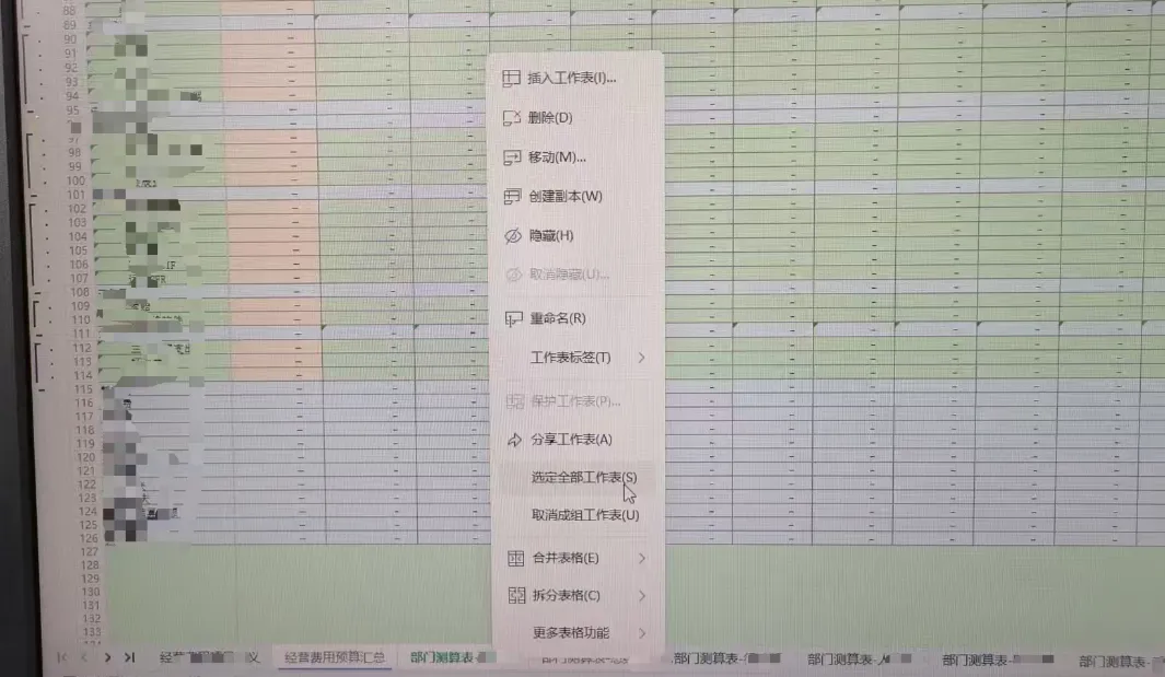 方法一:全选所有工作表:右键点击任意工作表标签--选定全部工作表。