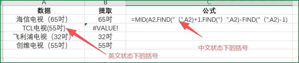 =IFERROR(MID(A3,FIND("(",A3)+1,FIND(")",A3)-FIND("(",A3)-1),"无匹配项")