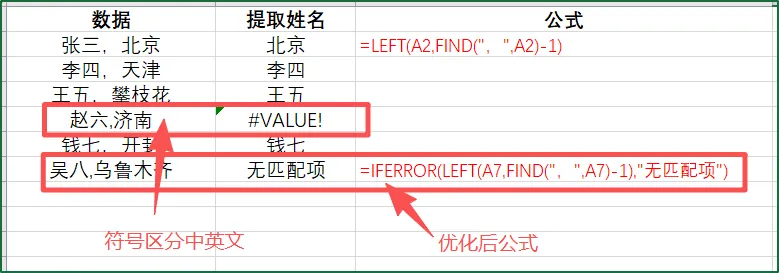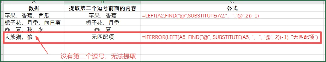 =IFERROR(LEFT(A7,FIND(",",A7)-1),"无匹配项")