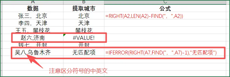 =IFERROR(RIGHT(A7,FIND(",",A7)-1),"无匹配项")