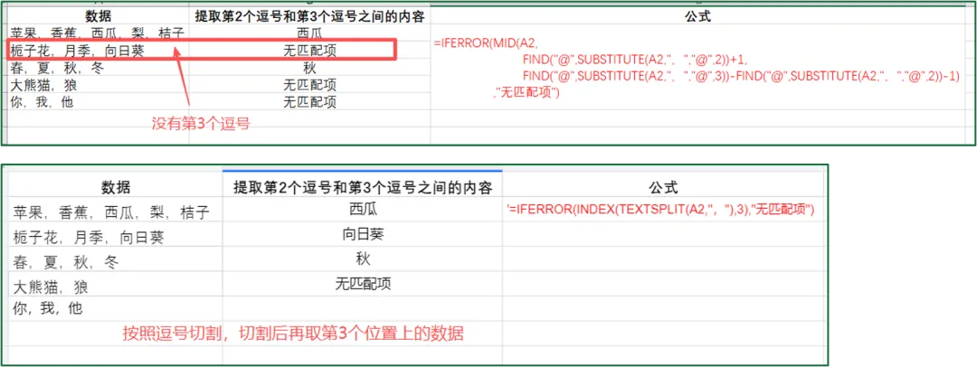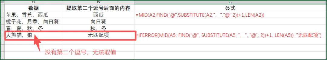 =IFERROR(MID(A5,FIND("@",SUBSTITUTE(A5,",","@",N))+1, LEN(A5)), "无匹配项")