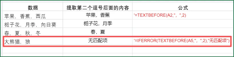 =IFERROR(TEXTBEFORE(A5,",",N),"无匹配项")