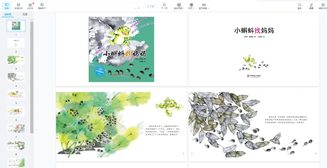 绘本阅读是幼儿教育的重要方式,但许多家长因孩子不识字或价格高而忽视其价值。实际上,绘本通过图文结合能同时刺激儿童的视觉和语言发展。优质绘本能提升儿童的认知、语言和社交能力。长期阅读对学业发展和亲子关系都有积极影响。绘本既是学习工具,也是亲子互动的桥梁。绘本PPT通过丰富多彩的故事和生动的画面,激发幼儿园儿童的学习兴趣,培养他们的阅读能力、想象力和创造力。 绘本PPT电子版画册涵盖了各种主题和风格,包括寓言故事、科普知识、生活常识、人际交往等方面,满足不同年龄段儿童的阅读需求。这些绘本不仅具有丰富的故事情节和精美的插图,还注重文字表达简洁易懂,适合幼儿园儿童阅读和理解。在一个阳光明媚的春天,池塘里生活着一群快乐的小蝌蚪。有一天,他们开始好奇自己的妈妈是谁。于是,他们决定出发去寻找他们的妈妈。他们在池塘里游来游去,遇到了大眼睛的金鱼阿姨,长脖子的天鹅姐姐,还有四条腿的大乌龟爷爷。每个动物他们都问:“您是我们的妈妈吗?”但是,他们都回答说不是。尽管失望,小蝌蚪们并没有放弃,他们继续向前游去。经过了漫长的旅程,小蝌蚪们渐渐长大,尾巴也逐渐消失,取而代之的是四条强壮的腿。最后,他们遇到了一只青蛙。她告诉他们,她是他们的妈妈。小蝌蚪们高兴极了,他们终于找到了他们的妈妈!“小蝌蚪找妈妈”是一个富有哲理和教育意义的中国经典童话故事。以小蝌蚪的视角让我们了解到青蛙的生长过程,这个故事主要描述了一群可爱的小蝌蚪在寻找他们母亲的过程中,经历了一系列的冒险和挑战,最终找到了他们的青蛙妈妈。