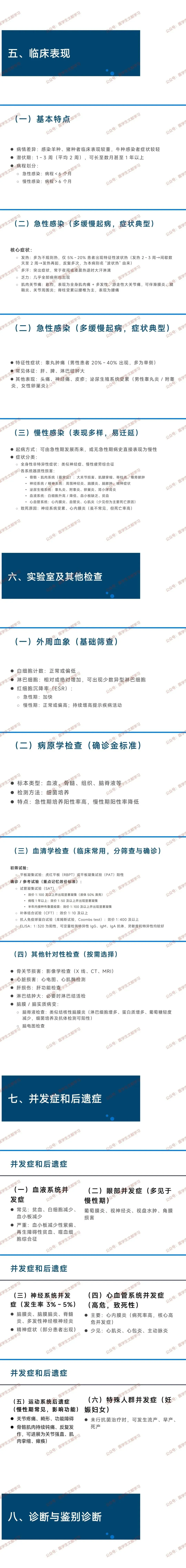 - 潜伏期:1~3 周,可长达数月,病程<6 个月为急性感染,>6 个月为慢性感染。