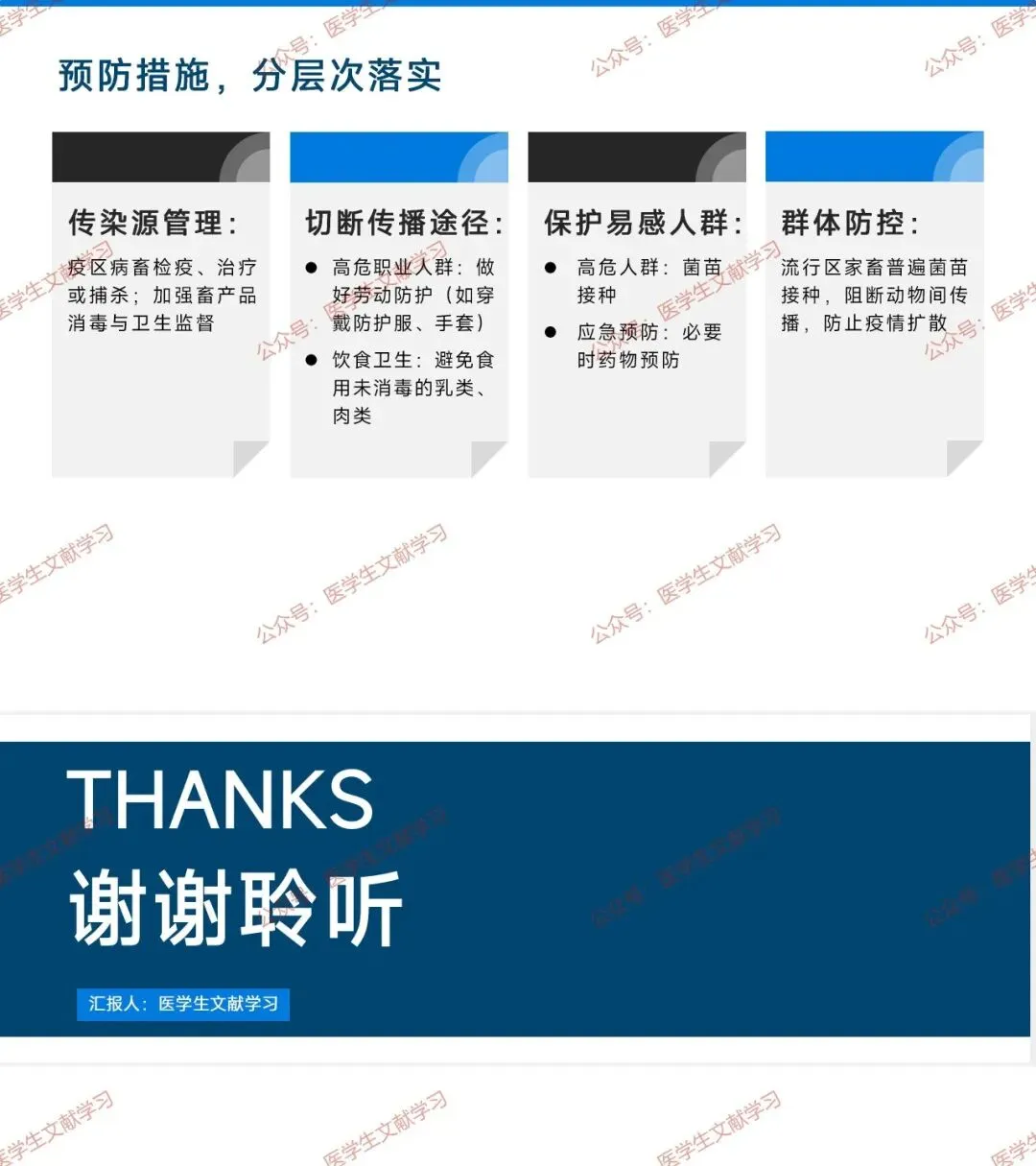 - 群体防控:流行区家畜普遍接种菌苗,阻断动物间传播。