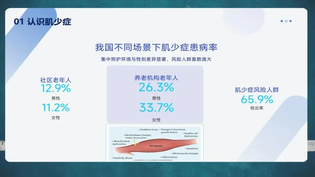 肌少症是与增龄相关的进行性骨骼肌疾病,有骨骼肌量减少、肌肉力量下降、肌肉功能减退三大特征。我国社区老年人肌少症患病率为 12.9%,养老机构更高,风险人群基数庞大,严重威胁老年人健康,增加跌倒、虚弱和死亡风险。