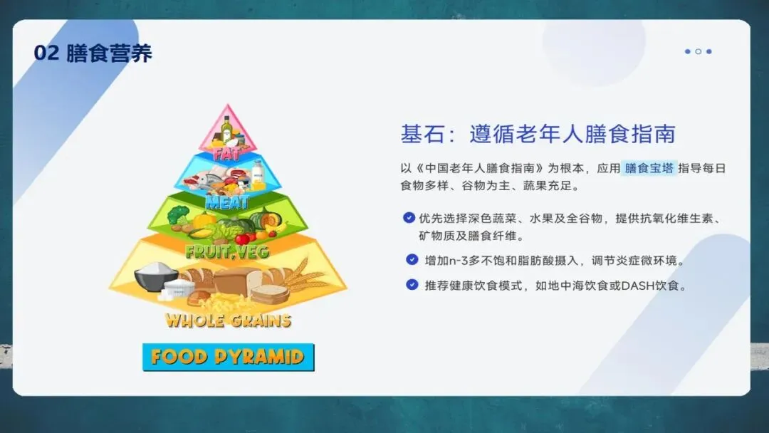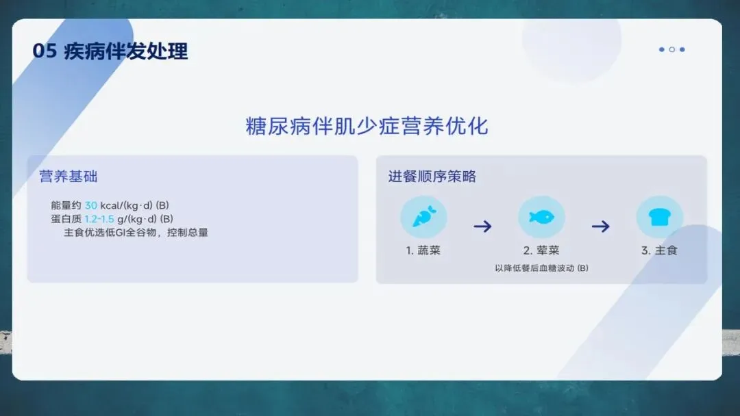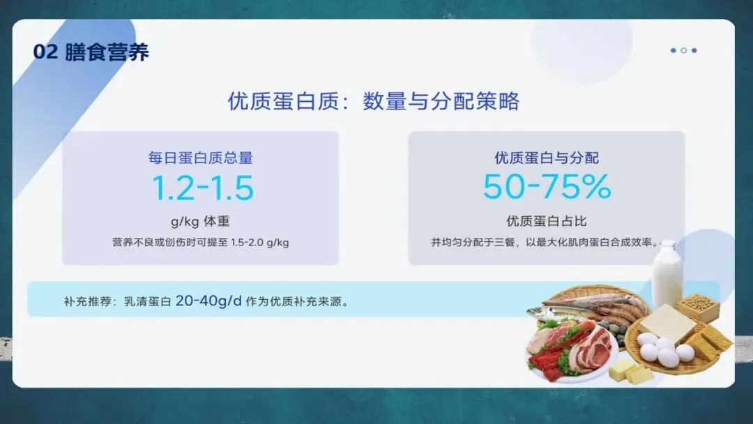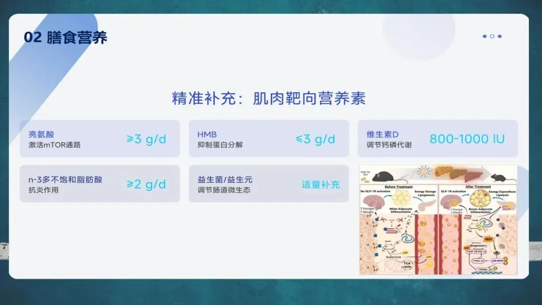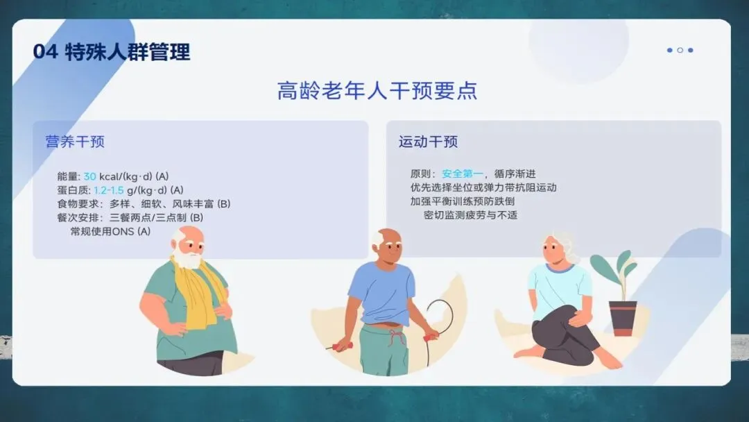 防治肌少症,合理营养和主动运动是关键。营养方面,要遵循老年人膳食指南,食物多样、谷物为主,多吃深色蔬果和全谷物,增加 n - 3 多不饱和脂肪酸摄入。每日蛋白质总量 1.2 - 1.5g/kg 体重,优质蛋白占比 50 - 75%,均匀分配三餐,还可补充乳清蛋白。精准补充亮氨酸、HMB、维生素 D 等肌肉靶向营养素。存在营养风险者,可选用口服营养补充。