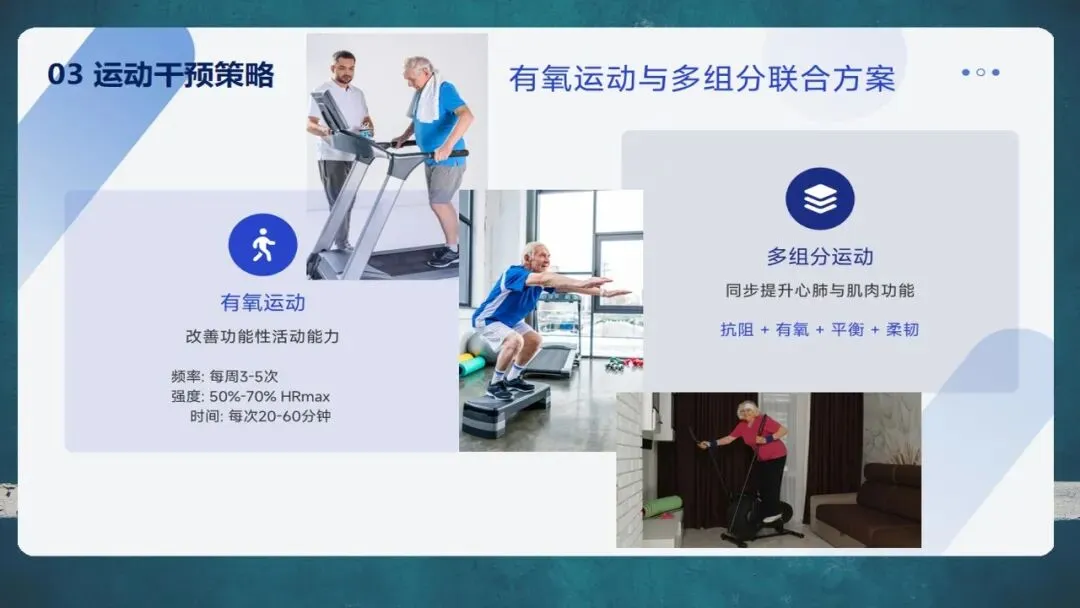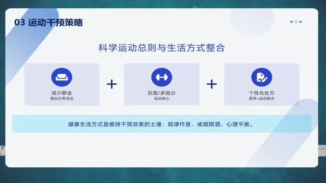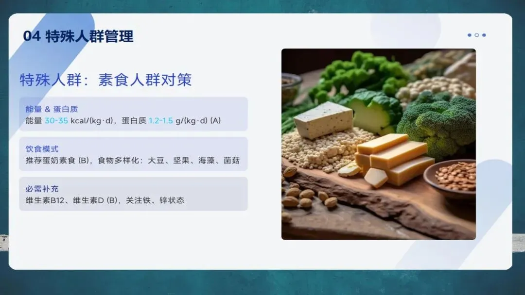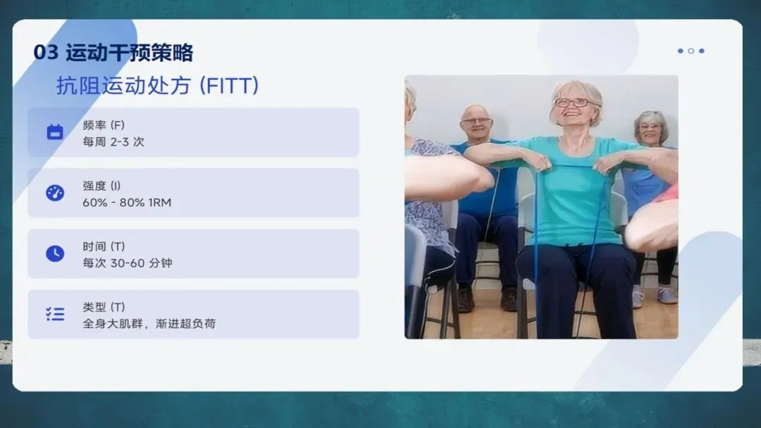 运动也不可或缺。抗阻运动每周 2 - 3 次,强度 60% - 80% 1RM,每次 30 - 60 分钟,针对全身大肌群,渐进超负荷。有氧运动每周 3 - 5 次,能改善功能性活动能力。多组分运动同步提升心肺与肌肉功能。对于特殊人群,如高龄老人、素食人群、合并营养不良者等,需制定个性化方案。