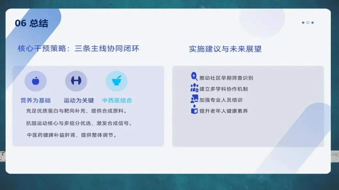 防治肌少症,营养是基础,运动是关键,二者协同,再加上中西医结合整体调节,能有效提升肌肉量与功能。让我们行动起来,积极预防和治疗肌少症,享受健康晚年!
