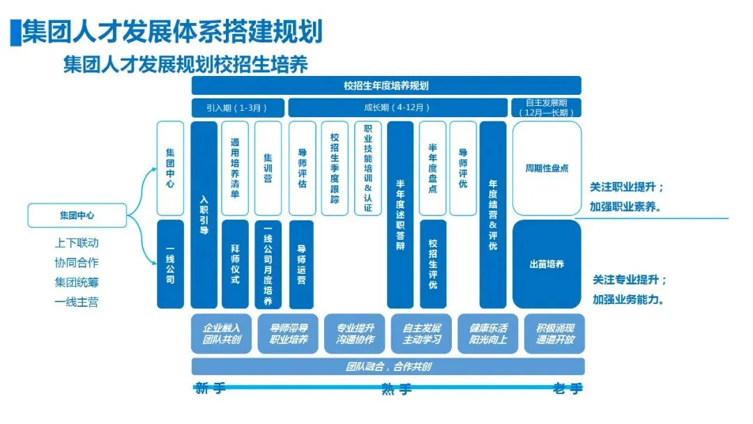 分层培养: 针对性的新员工培训、校招生培养、储备经理/总监/总经理班。