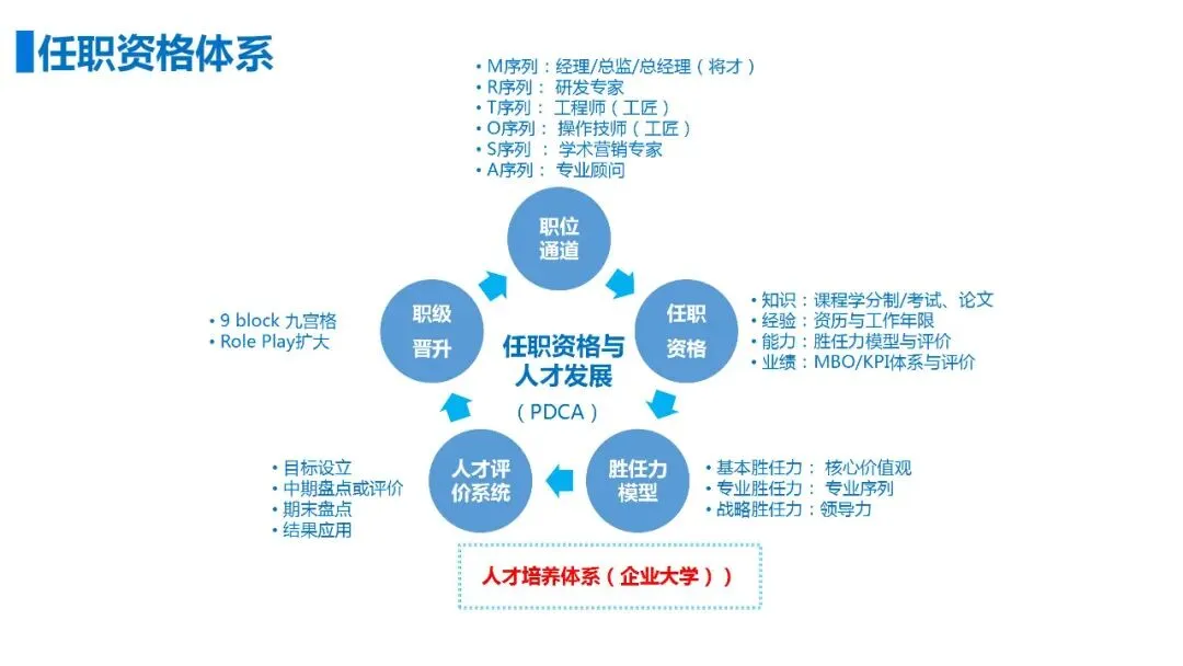 “用”与“评估”: 建立了以任职资格标准(知识、经验、能力、业绩)和绩效管理(KPI/MBO)为基础的人才评估机制,并运用“九宫格”等工具进行人才盘点。
