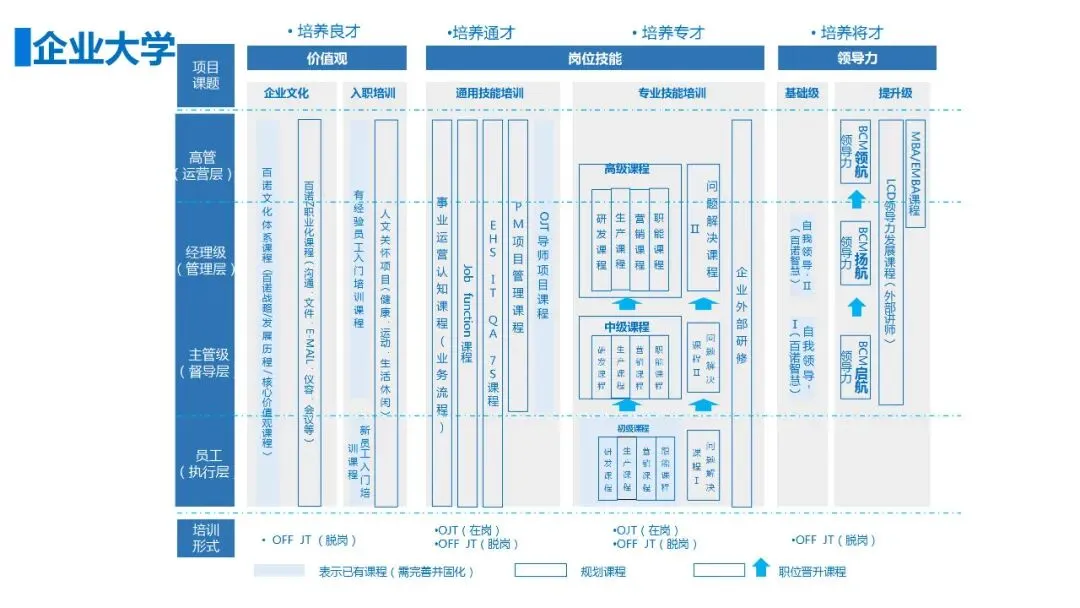 核心项目: 强调了导师制、IDP(个人发展计划)、关键能力打造、企业大学(商学院与专业学院)等关键培养手段。