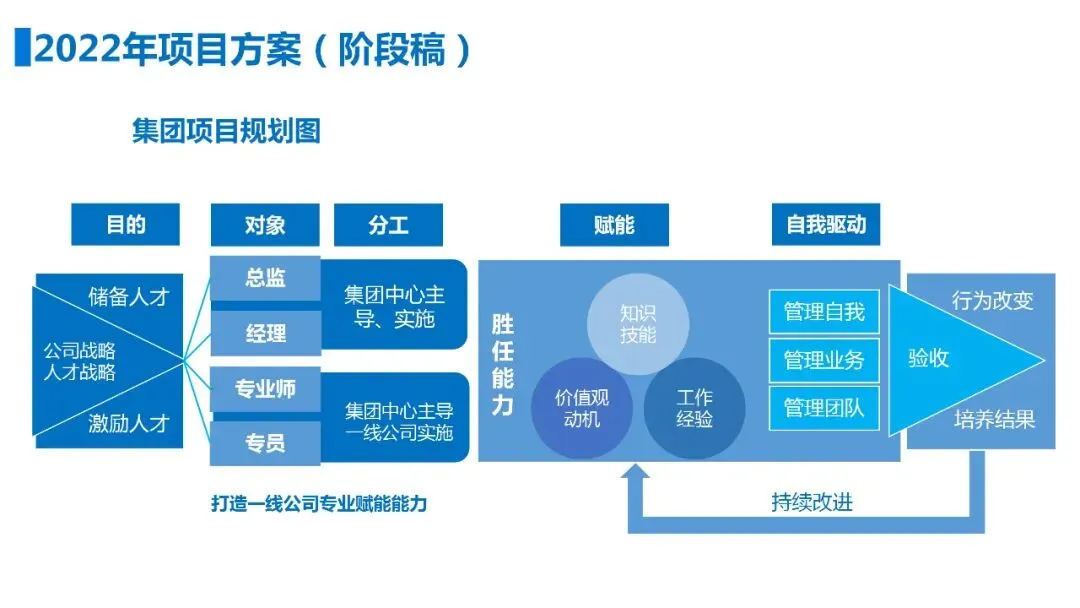 实施保障:展示了详细的年度关键项目排期、流程设计(如选拔培养流程图)、以及课程体系规划,确保了方案的落地性。最终目标是通过这一套体系的搭建,实现人才价值的最大化,持续为集团输送“良才、专才、将才、通才”。