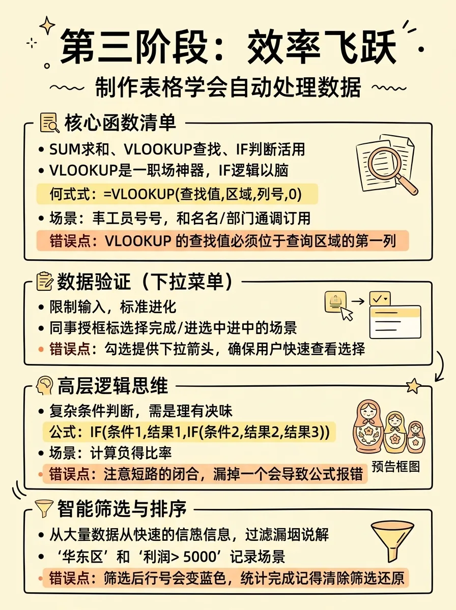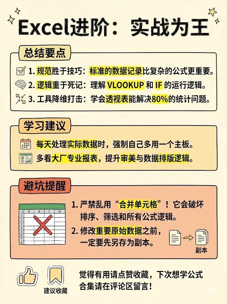 别再瞎啃 Excel 技巧啦!这套从新手到大神的系统路径,帮你高效搞定职场数据:先理清“工作簿 > 工作表 > 单元格”逻辑,练熟基础操作与数据规范;再做好标准化录入,用基础算法和序列填充提升效率;接着吃透 VLOOKUP、IF 等核心函数,搭配数据验证与筛选排序,让表格自动处理数据;然后靠透视表和专业图表,把数据变成直观易懂的分析结果;最后牢记“规范胜于技巧”,避开合并单元格等坑,在实战中练出职场数据硬实力。最后想跟你说:别让 “等有空再学” 耽误了成长。 把这篇收藏起来,下次做报表时就对照着练,哪怕每天只搞定一个小技巧,也能慢慢摆脱加班困境。愿你都能靠 Excel 高效搞定工作,把更多时间留给生活~