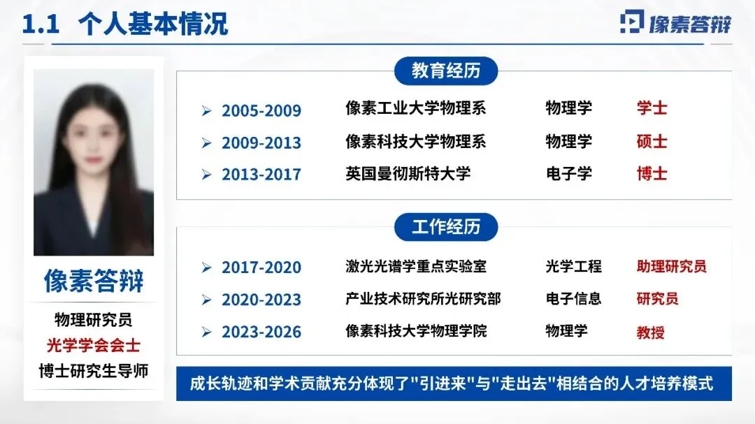 开篇直击超快激光产生与调控技术领域核心瓶颈(如超短脉冲压缩极限、调控精度不足、新型光源产生机制不明),以 “超短脉冲产生与精准调控机理” 为桥定靶向;中段按 “个人基础 - 学术突破 - 支撑条件” 递进讲成果;结尾升华为超快激光领域 “理论 - 技术 - 应用” 新范式,形成 “问题 - 突破 - 延展” 完整逻辑链。