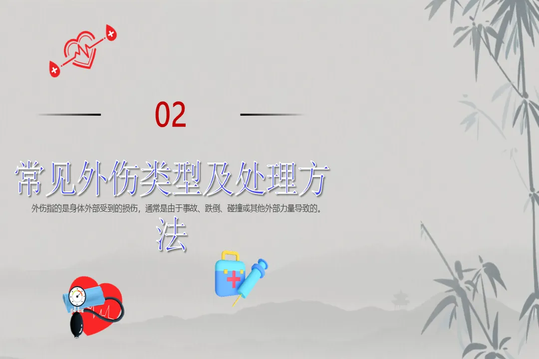 各位朋友,大家好!今天我们一起来学习外伤急救的相关知识,外伤在生活中十分常见,从日常的擦伤、扭伤到意外导致的骨折、大出血,掌握正确的急救方法,不仅能减轻伤者痛苦,更能在关键时刻挽救生命、防止并发症,这也是我们今天学习这门知识的重要意义。