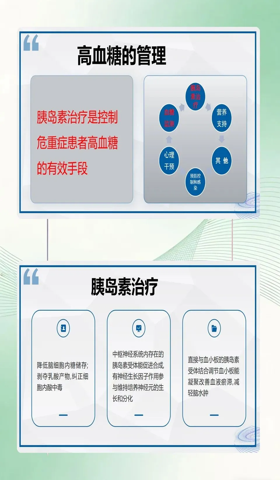 接下来看高血糖诊断标准:WHO规定空腹血糖6.17.0mmol/L、餐后8.111.1mmol/L,超上限为糖尿病性高血糖;无糖尿病病史者,入院后随机2次及以上空腹≥6.9mmol/L或随机≥11.1mmol/L,诊断为应激性高血糖。需注意,无论是否有糖尿病史,重症患者中高血糖和胰岛素抵抗均普遍存在。
