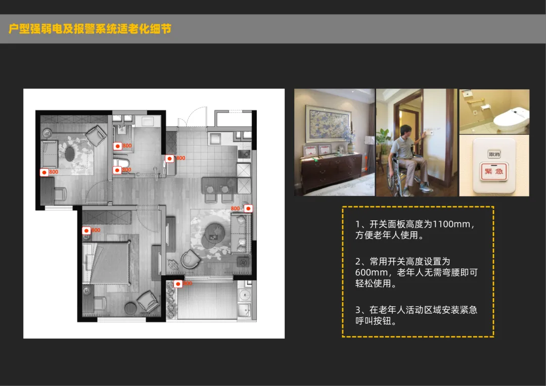 含入户 / 客卧 / 厨卫 / 阳台改造要点、适老材质 / 色彩 / 智能设备应用、扶手 / 照明 / 紧急报警等核心细节设计指南