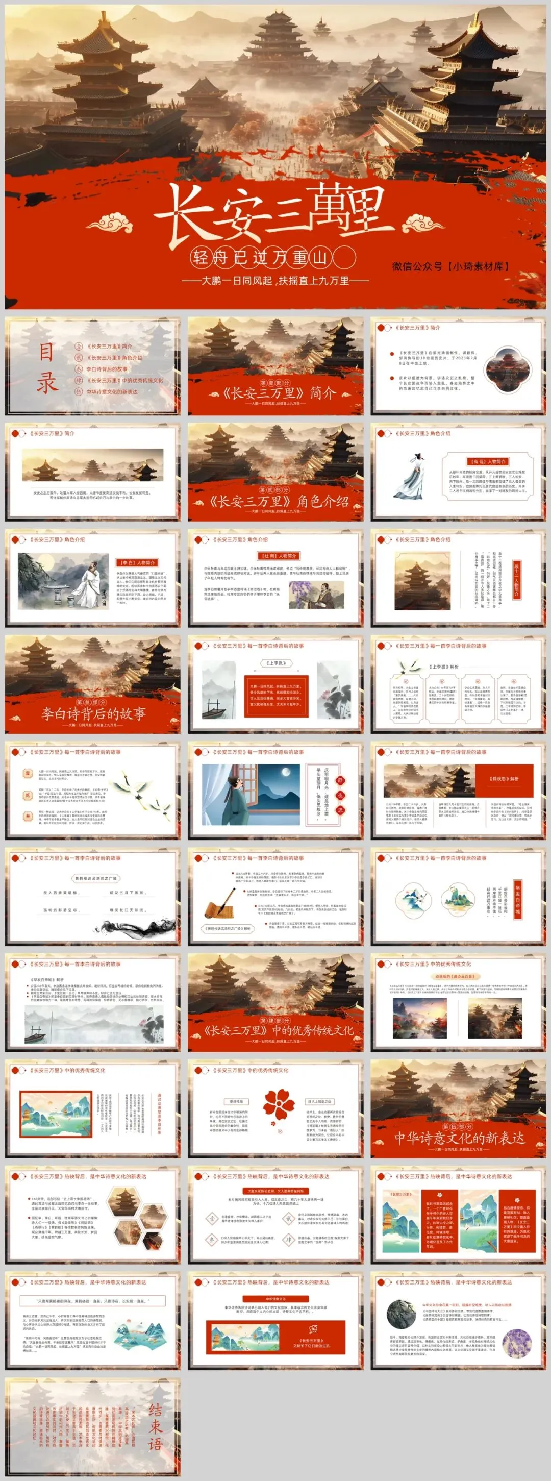 唐朝,作为中国历史上最重要的朝代之一,也是公认的中国最强盛的时代之一。在唐朝的历史星空中,唐太宗李世民无疑是最为耀眼的那一颗。朝的文化繁荣,更是令人叹为观止。唐代建筑规模宏大,设计上融合了中原本土风格与外来影响,如檐角翘起、斗拱层叠等建筑手法,使得宫殿、寺庙、塔楼等建筑显得格外壮丽。唐代书法艺术以飘逸著称,如张旭的草书,其作品如行云流水,充满动感,体现了唐代书法艺术追求自然、追求个性表达的审美趋向。唐代陶瓷艺术形式多样,如唐三彩以其独特的三彩釉色(黄、绿、白)闻名于世,这种陶瓷艺术形式在唐代达到了顶峰。本期唐朝文化PPT模板,带您一起了解唐朝文化!