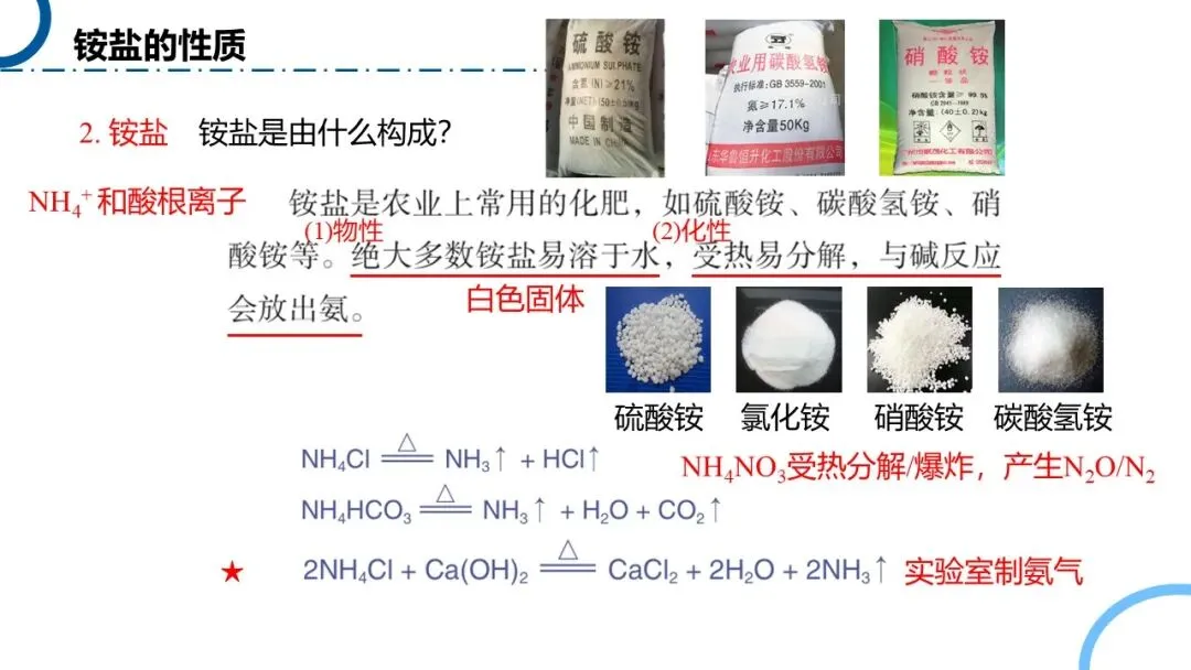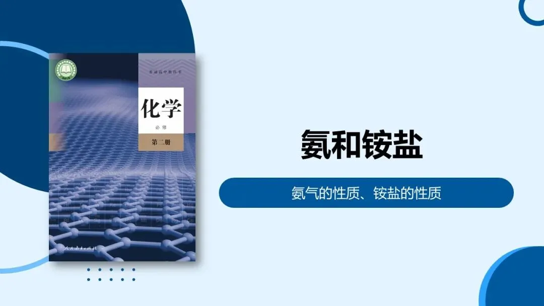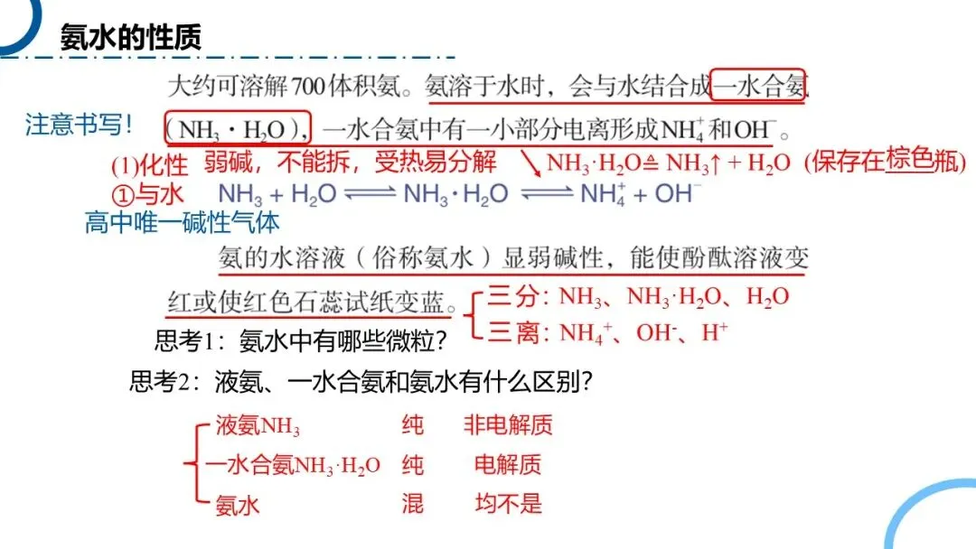 这一节简单讲评晚读练习后,开始学习氨的性质,最重要的是与水反应,既包含了极易溶于水的特点,又包含与水反应后的混合溶液体系。之后再学习铵盐的物理性质和化学性质。